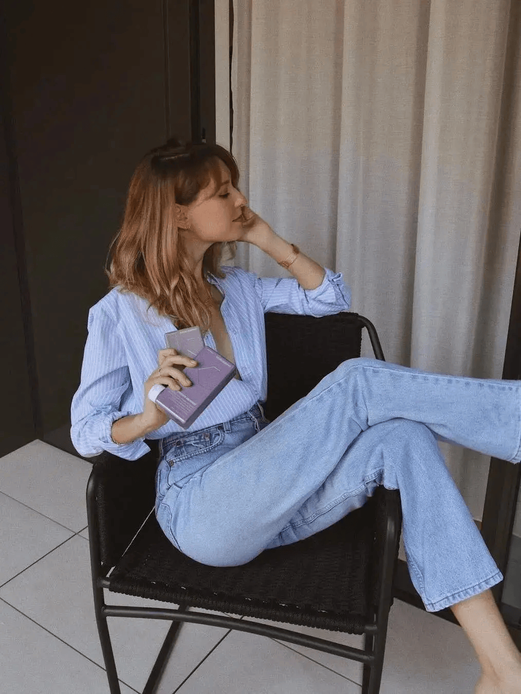 衬衫+九分牛仔裤:白色衬衫(宽松款)+蓝色直筒九分裤,脚踩红色单鞋,撞色亮眼,适合30+女性减龄。