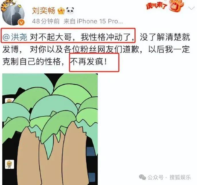 知道是误会之后,刘奕畅也发文给洪尧道了歉,说是自己冲动了。