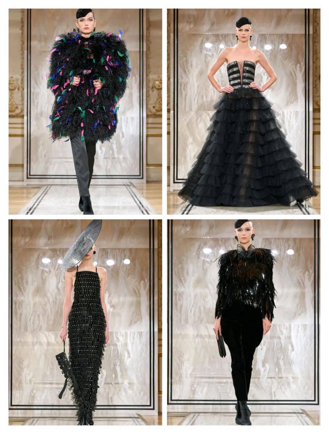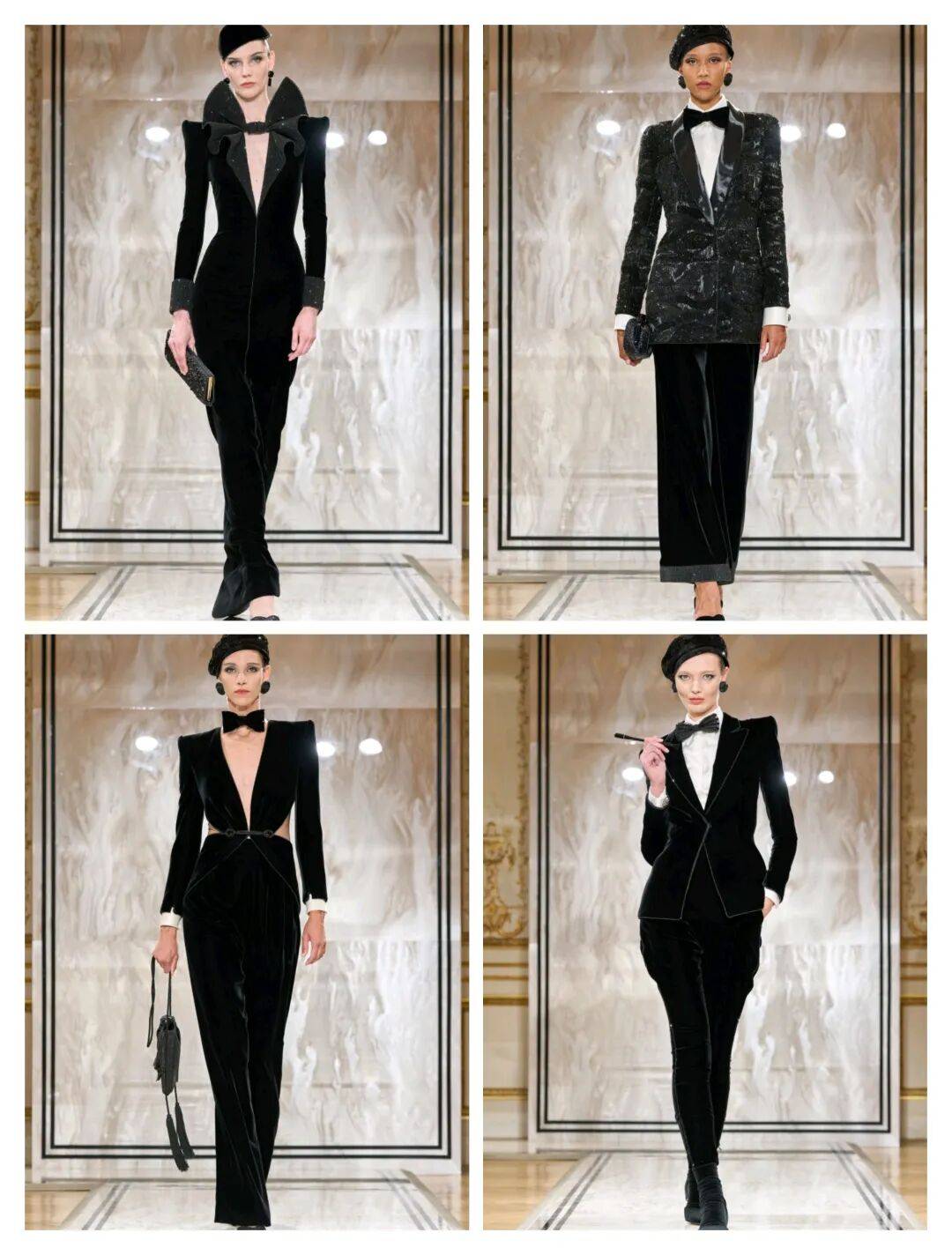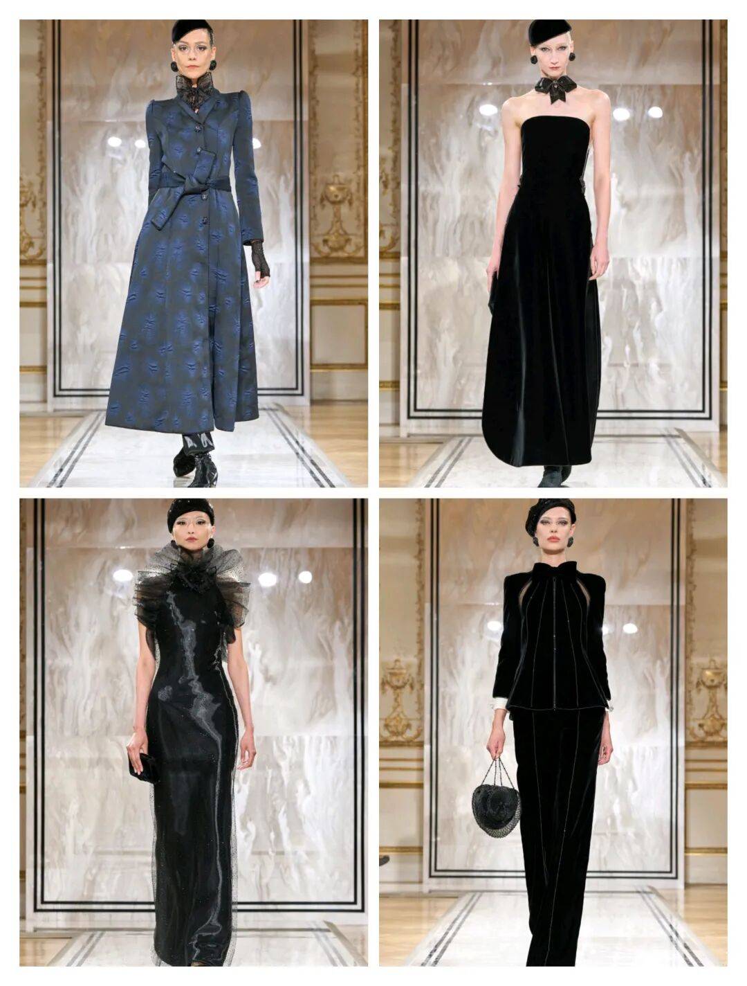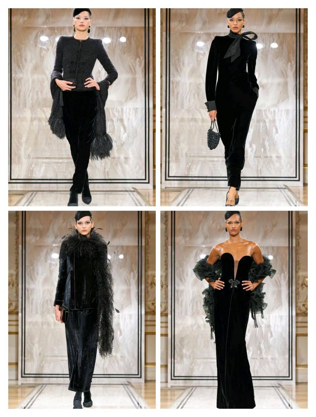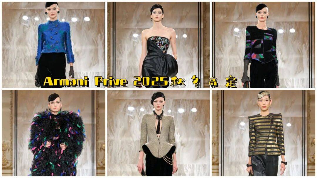 Armani Prive 2025秋冬高定,这些服装在黑色系为主中打造暗黑色系的神秘感,结合天鹅绒、光泽面料等材质也多了奢华华丽的时尚质感。