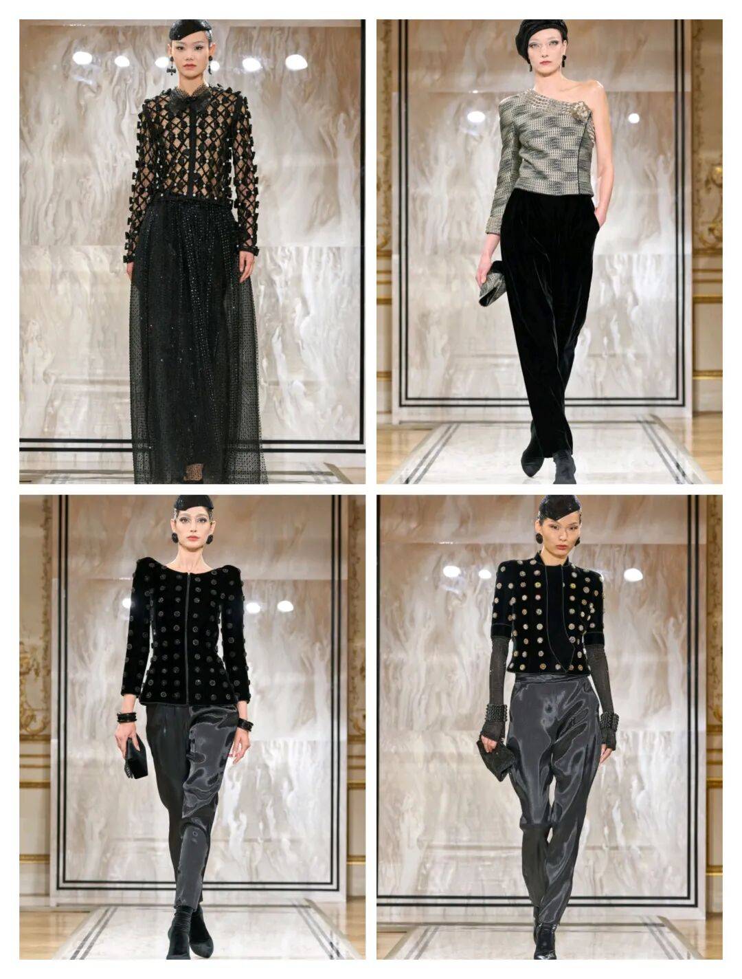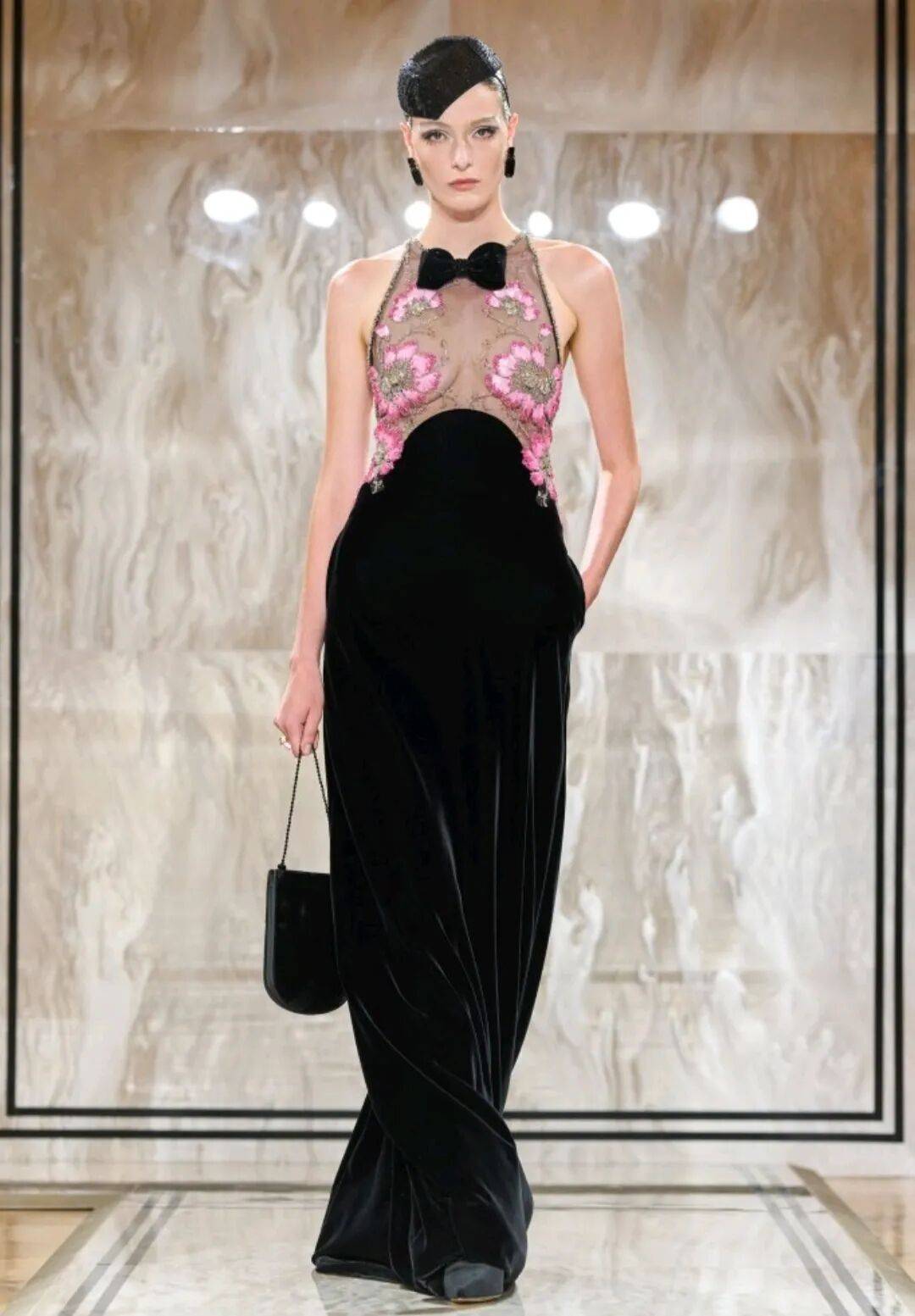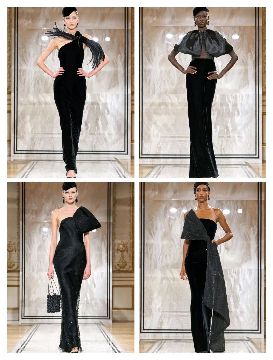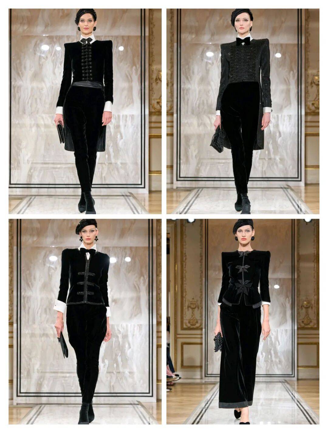 Armani Prive 2025秋冬高定,这些服装在黑色系为主中打造暗黑色系的神秘感,结合天鹅绒、光泽面料等材质也多了奢华华丽的时尚质感。