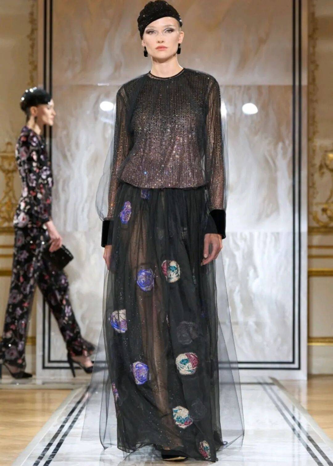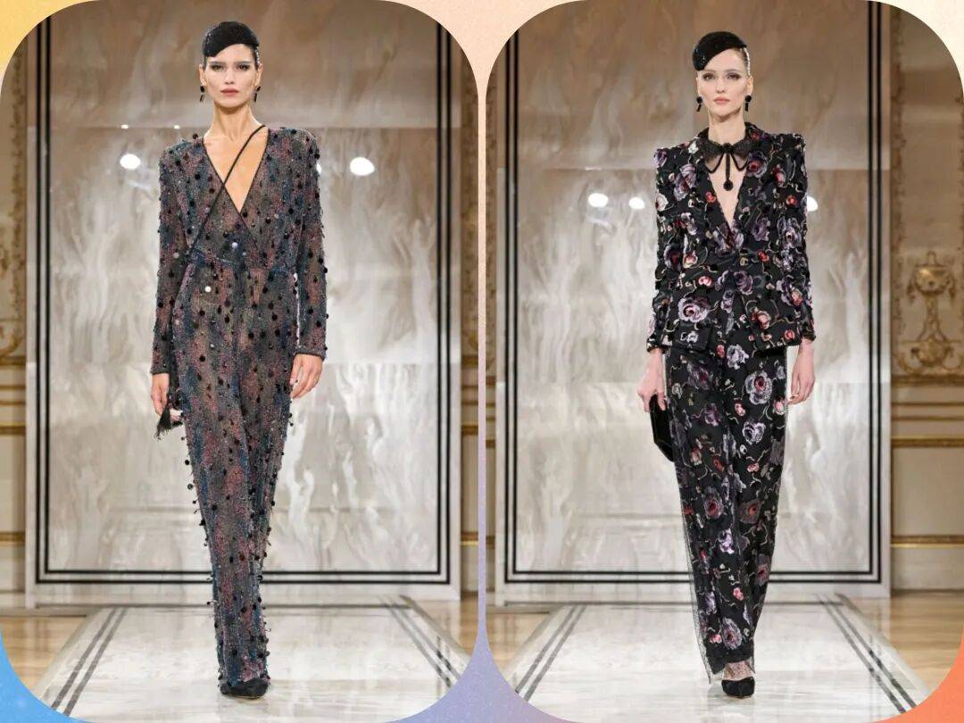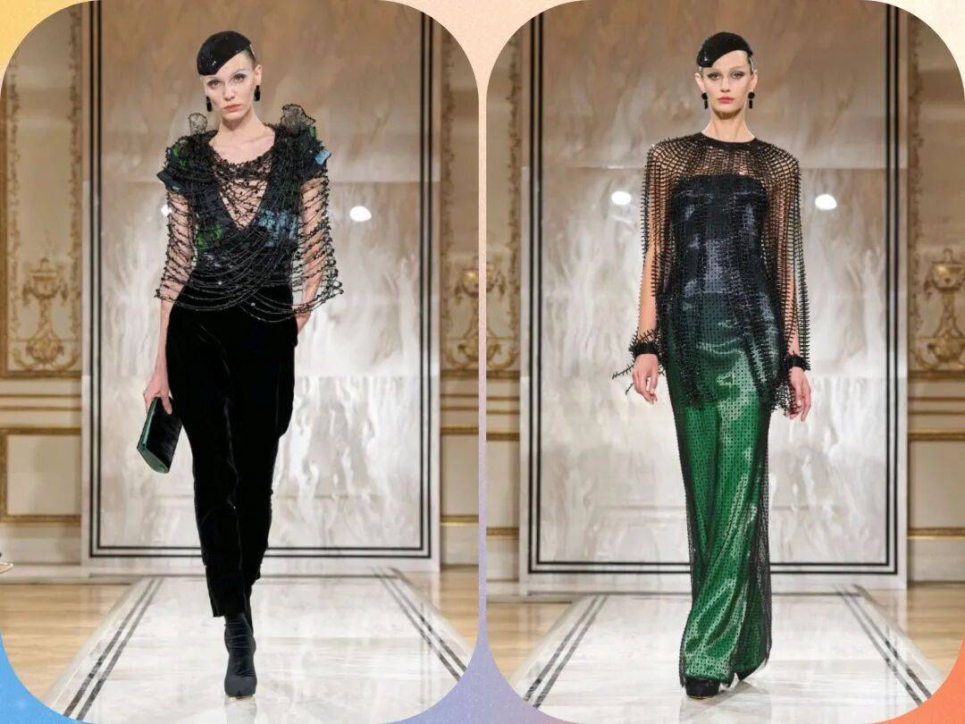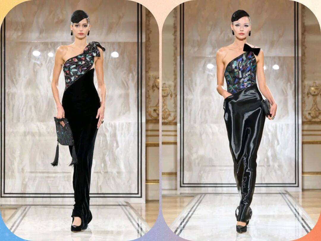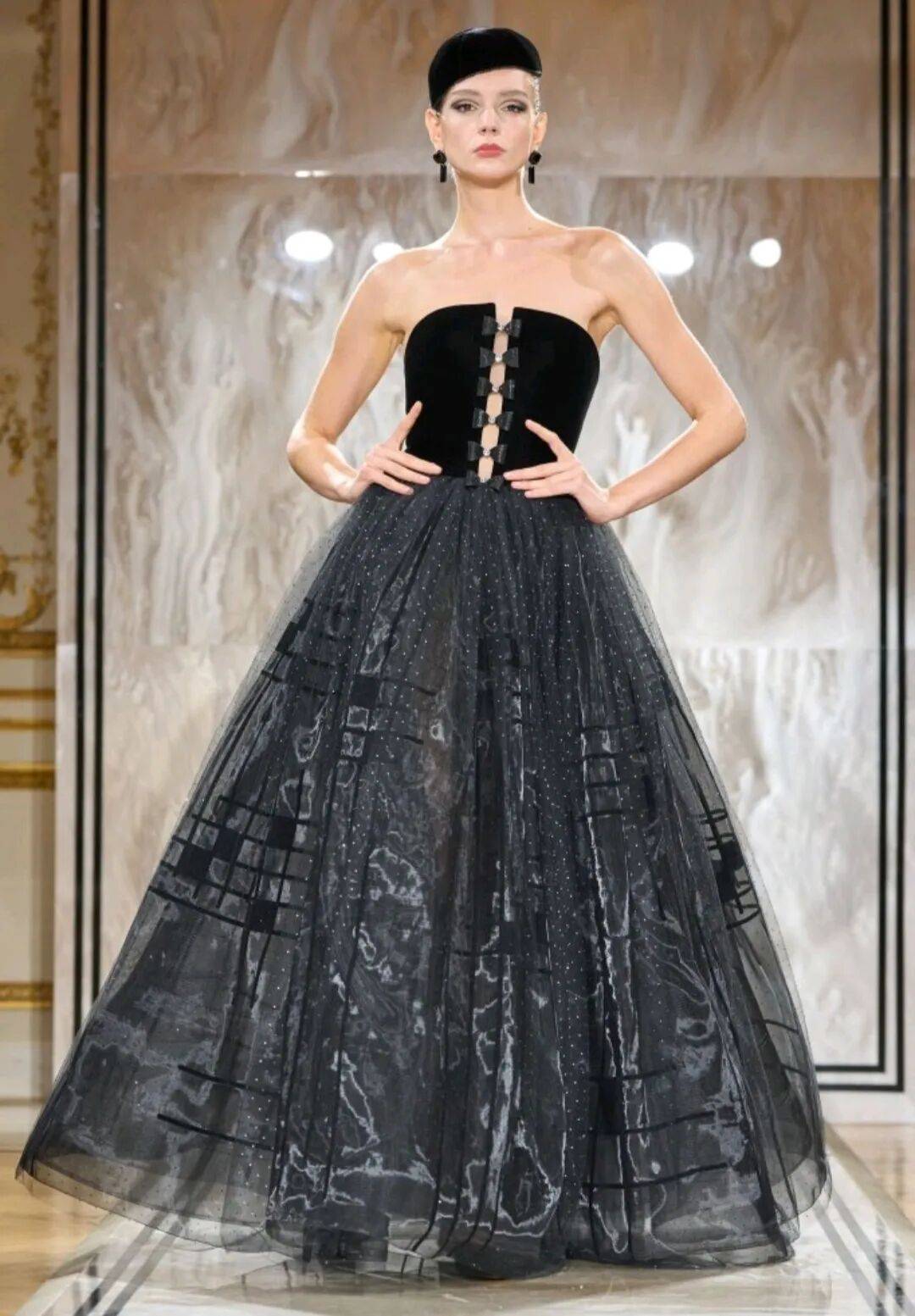 Armani Prive 2025秋冬高定,这些服装在黑色系为主中打造暗黑色系的神秘感,结合天鹅绒、光泽面料等材质也多了奢华华丽的时尚质感。