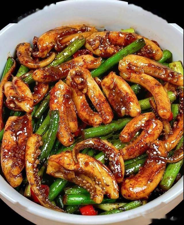 ②锅中油热下葱蒜,小米椒翻炒爆香,加1勺豆瓣酱炒出红油,下鱿鱼须大火翻炒1分钟。