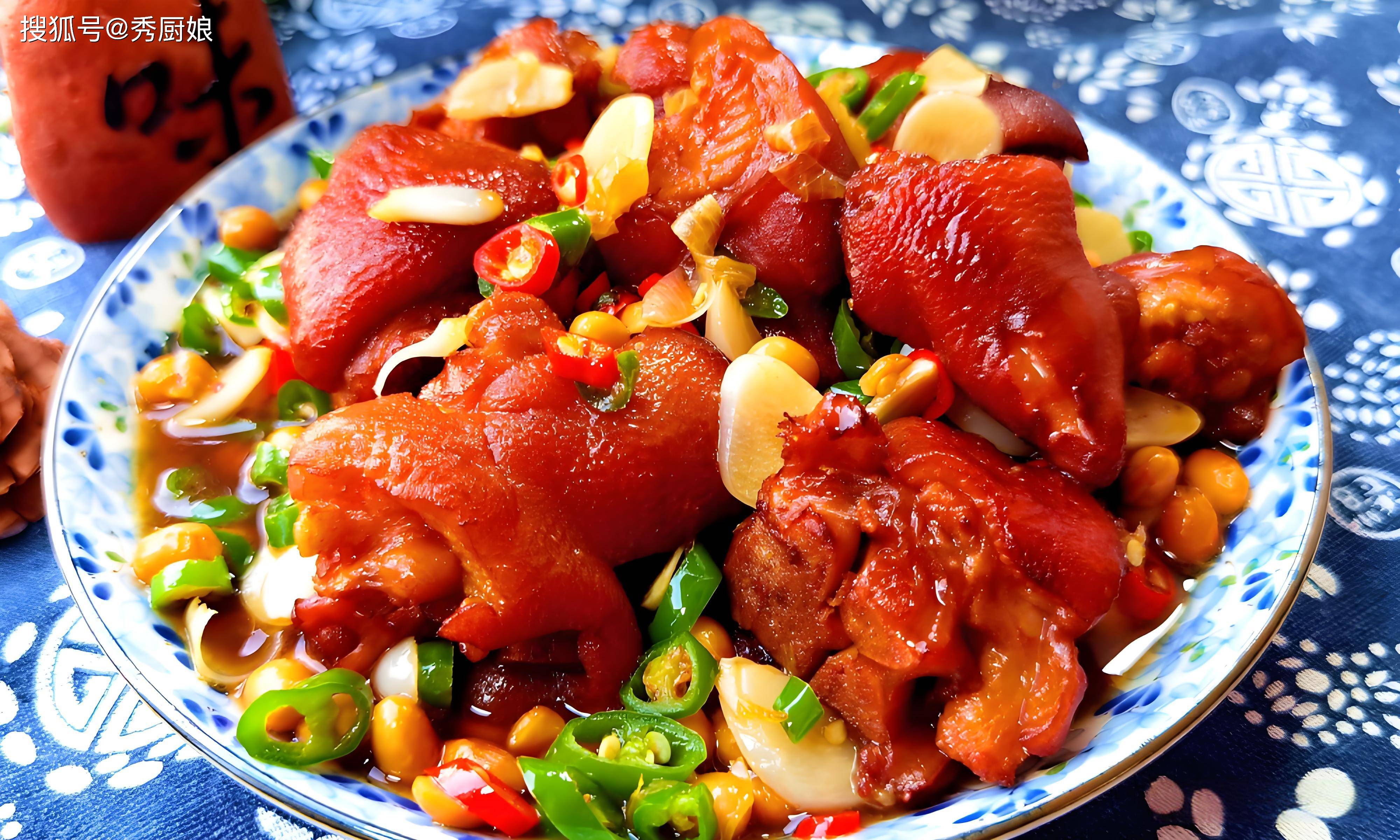 4. 把电饭煲里的猪蹄和黄豆倒进来,大火翻炒收汁,让每块猪蹄都裹上香辣的蒜蓉,出锅撒点葱花,香得能多吃两碗饭!