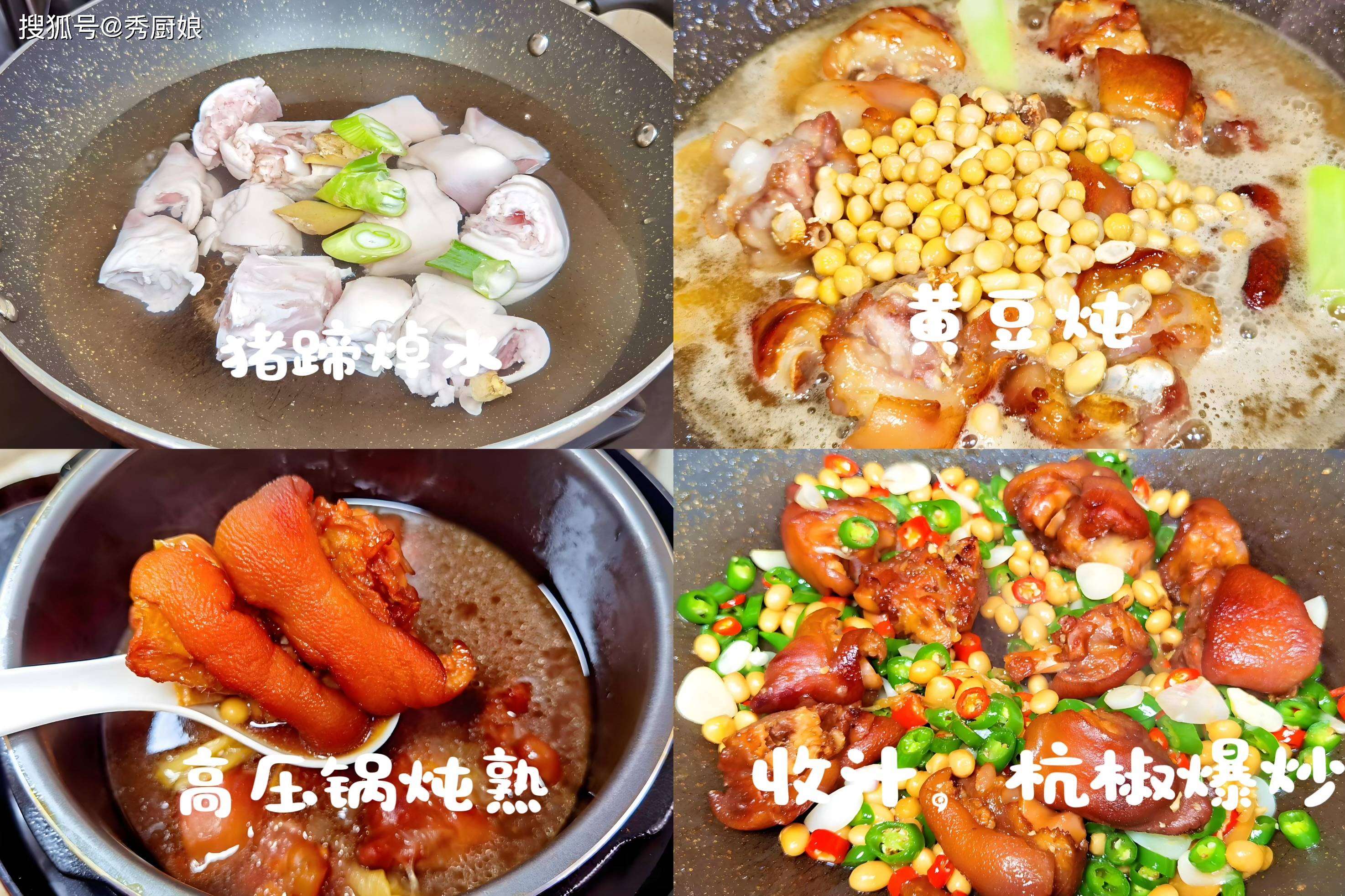 1. 猪蹄剁块,冷水下锅,加料酒和姜片焯一下,捞出洗干净。