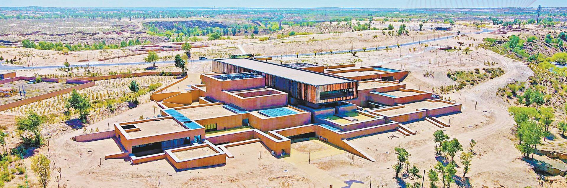 位于无定河南岸的沙丘台塬上、与统万城遗址隔岸相望的统万城遗址博物馆,在外形设计上给人强烈的视觉冲击和身临其境的体验感:这是一座覆土式特色建筑的情境体验“考古”博物馆,它在建筑设计上采取消隐手法,好似一个个考古“探坑”,又像一只巨型“沙漠宝盒”,它的大半藏身于地下,人行走其上,就好像是置身于“遗址”之上。