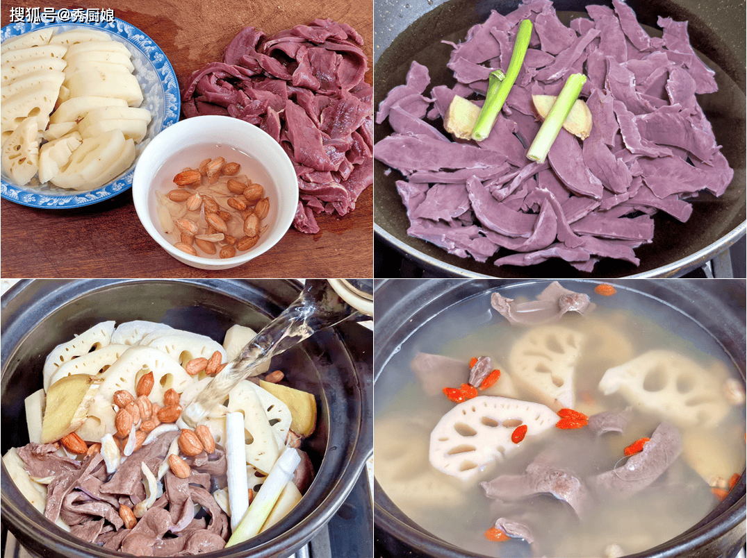 食材:猪心1个、莲藕1节、花生半碗、干百合15克、枸杞10克、姜3片、盐适量