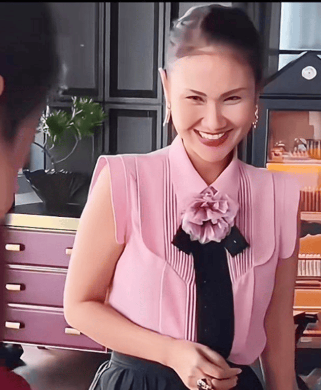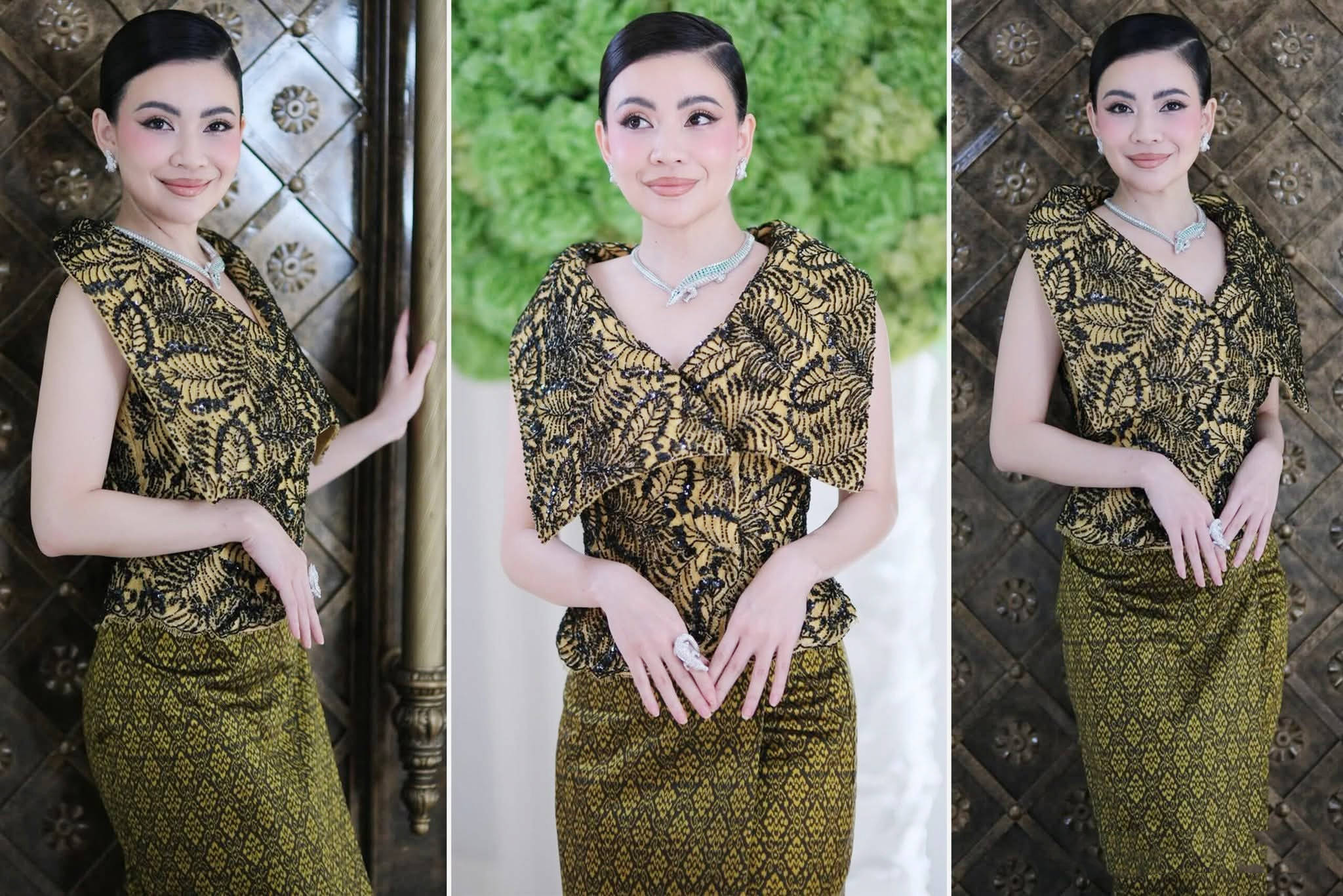 任彩琳最具辨识度的穿搭,当属对高棉传统服饰的现代重构。她深谙传统服饰的精髓,却不拘泥于古板形制,常以 “复古基底 + 现代剪裁” 的方式,赋予传统服饰新的生命力。