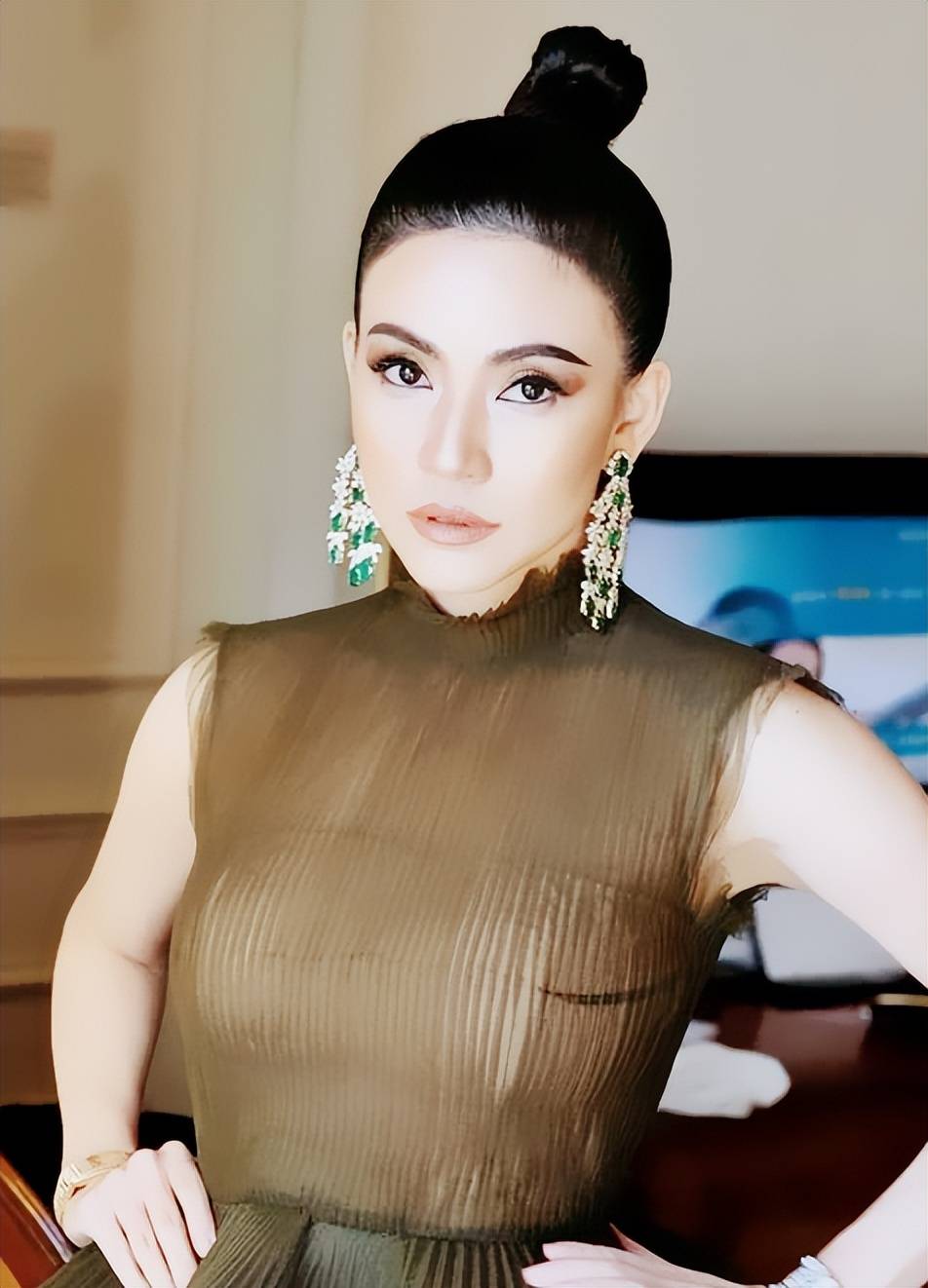 配饰的搭配更显巧思,是她传统造型 “奢华感” 的点睛之笔。她偏爱多层项链组合,常以一条细巧的金质锁骨链为基底,叠戴镶嵌红宝石或蓝宝石的颈链,宝石的色泽与锦缎的底色相互映衬,华贵而不浮夸。耳环多选择水滴形或莲花形的金饰,与服饰纹样呼应,细节处彰显精致。