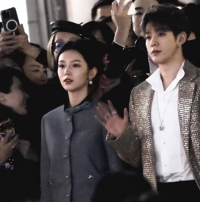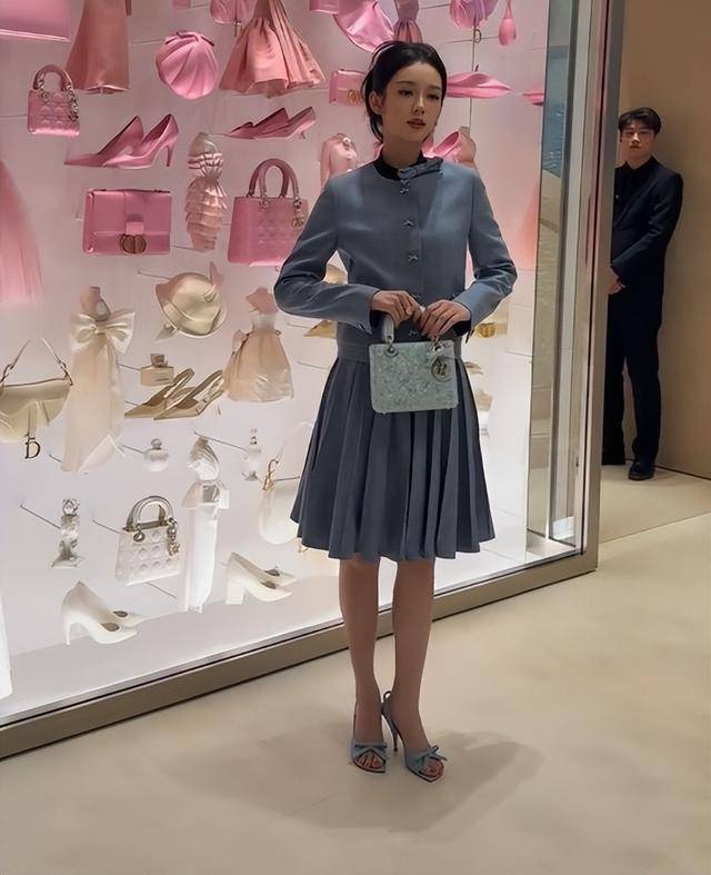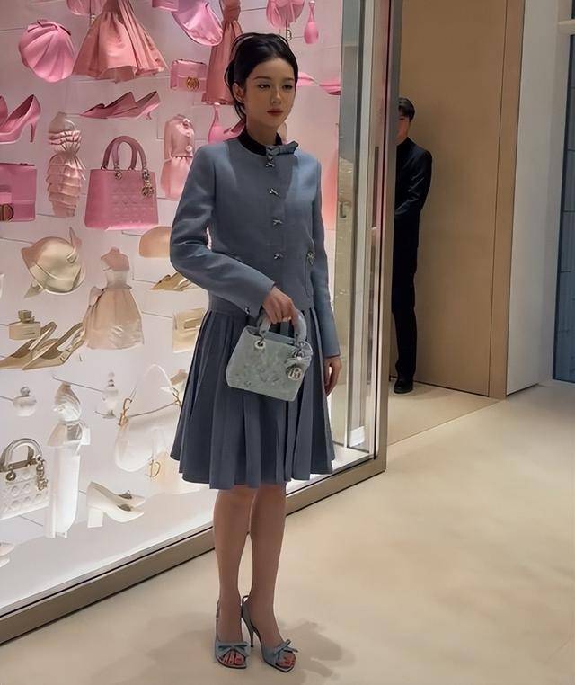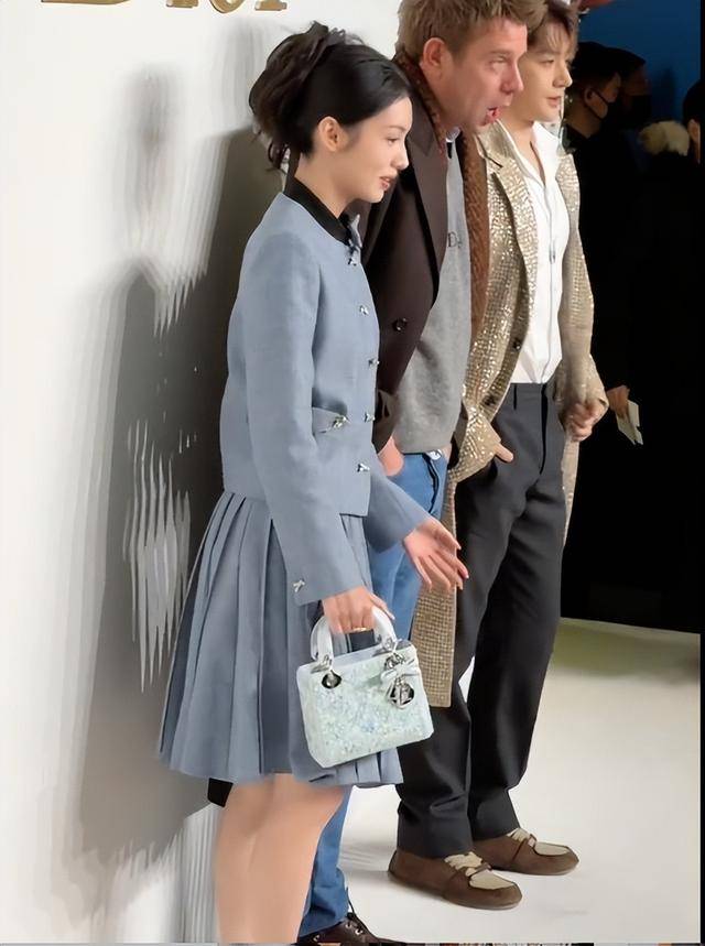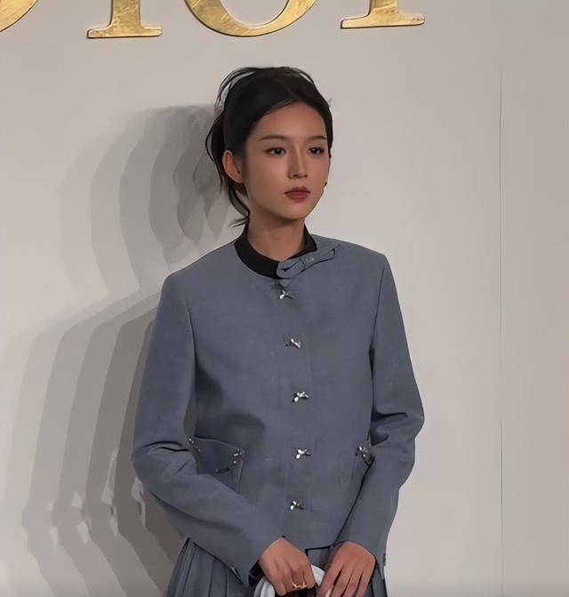 周也作为迪奥偏爱的95后小花,身着灰蓝色小香风西装套裙,剪裁利落,领口银色链条点缀,整体造型清新淡雅。然而生图中,其面部状态下滑明显,法令纹和苹果肌凹陷清晰可见,与戛纳红毯时的状态差距显著。更尴尬的是弯腰动作略显僵硬,被网友吐槽“像餐厅服务生”。尽管如此,她的优雅气质仍获部分认可,与设计总监交流时的落落大方展现了良好素养。