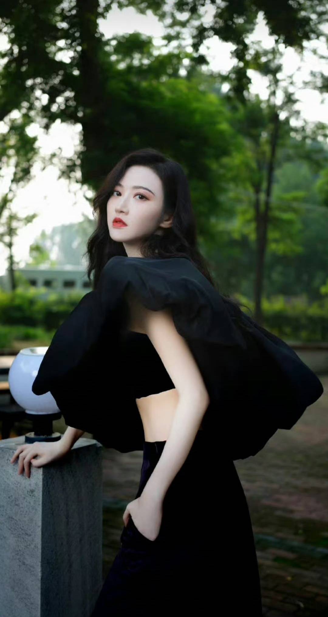 黑色长裙搭配复古盘发造型,但假发套贴合度差,呈现“扁塌湿漉”效果,贵气感大打折扣。