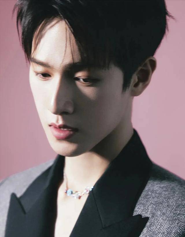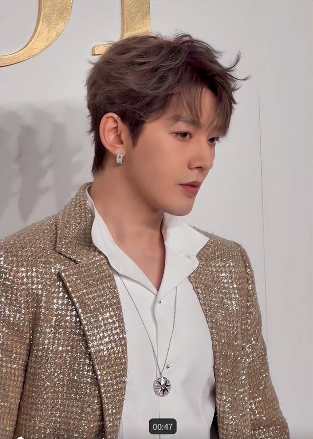 鎏金亮片西装配银色耳钉,贴身剪裁领口开V露锁骨,他又配了一对耳钉,精致发型是油头,妆容是那种男士眉笔脸蛋白净,