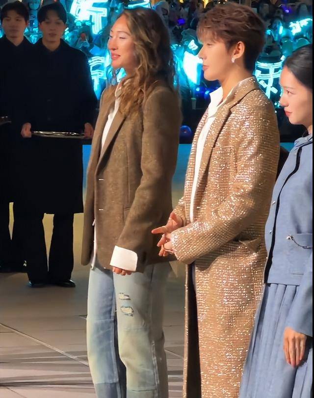虽然她穿高跟鞋走路有点晃,但1米82的身高往那一站,旁边1米65的周也瞬间变成“小矮人”。