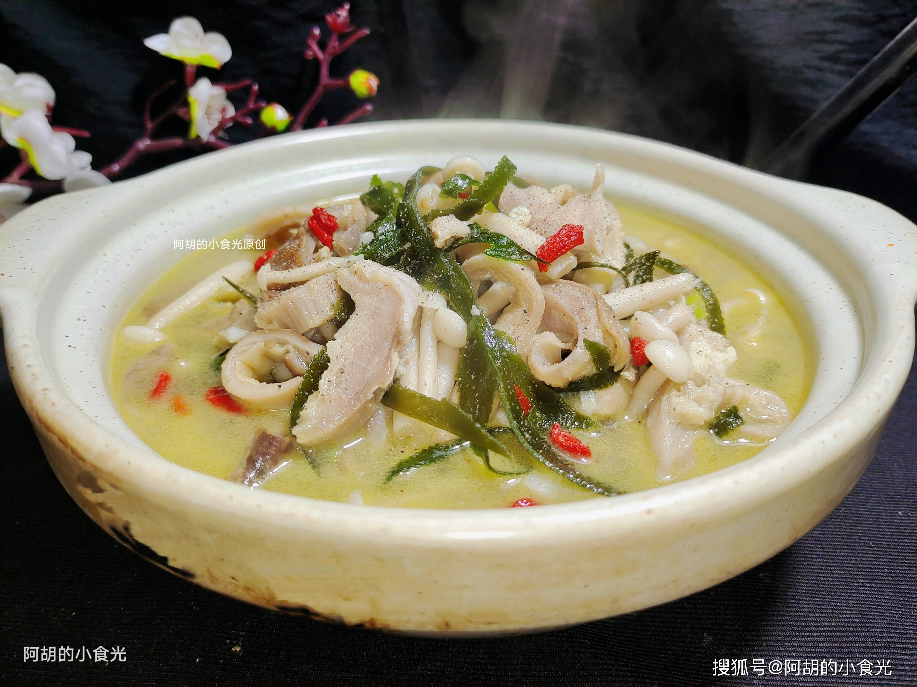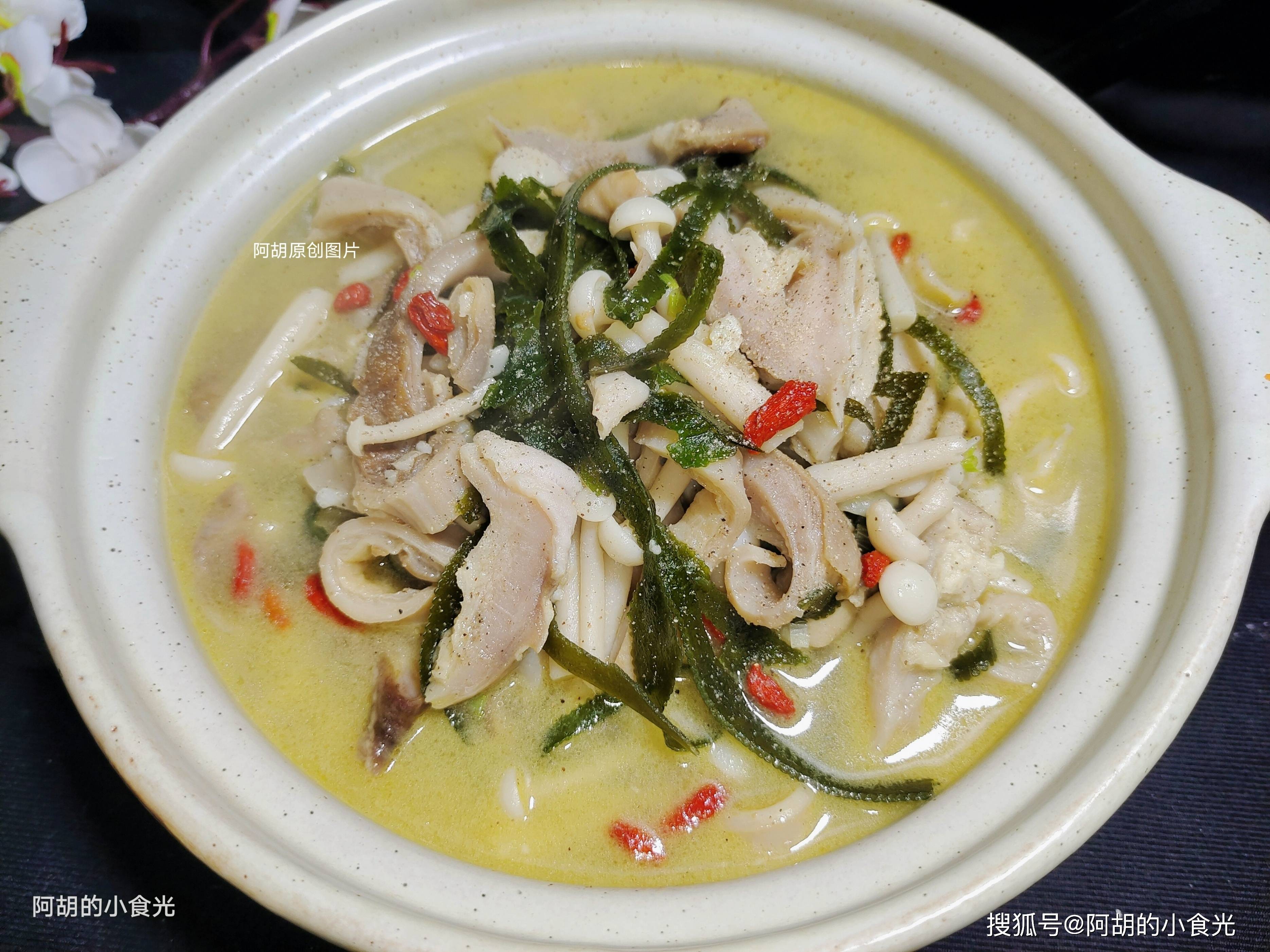 第五步:焖煮十分钟后,让各食材的鲜香味充分地释放,最后还要再撒入一些白胡椒粉提味,再撒入几粒枸杞点缀后就可以出锅装盘了。一道做法很简单的汤菜,猪肚和海带、蘑菇的搭配,充分享受食材原本的鲜香味,热乎乎的一锅,连汤也要喝掉,感兴趣的一定要试一试这个做法。