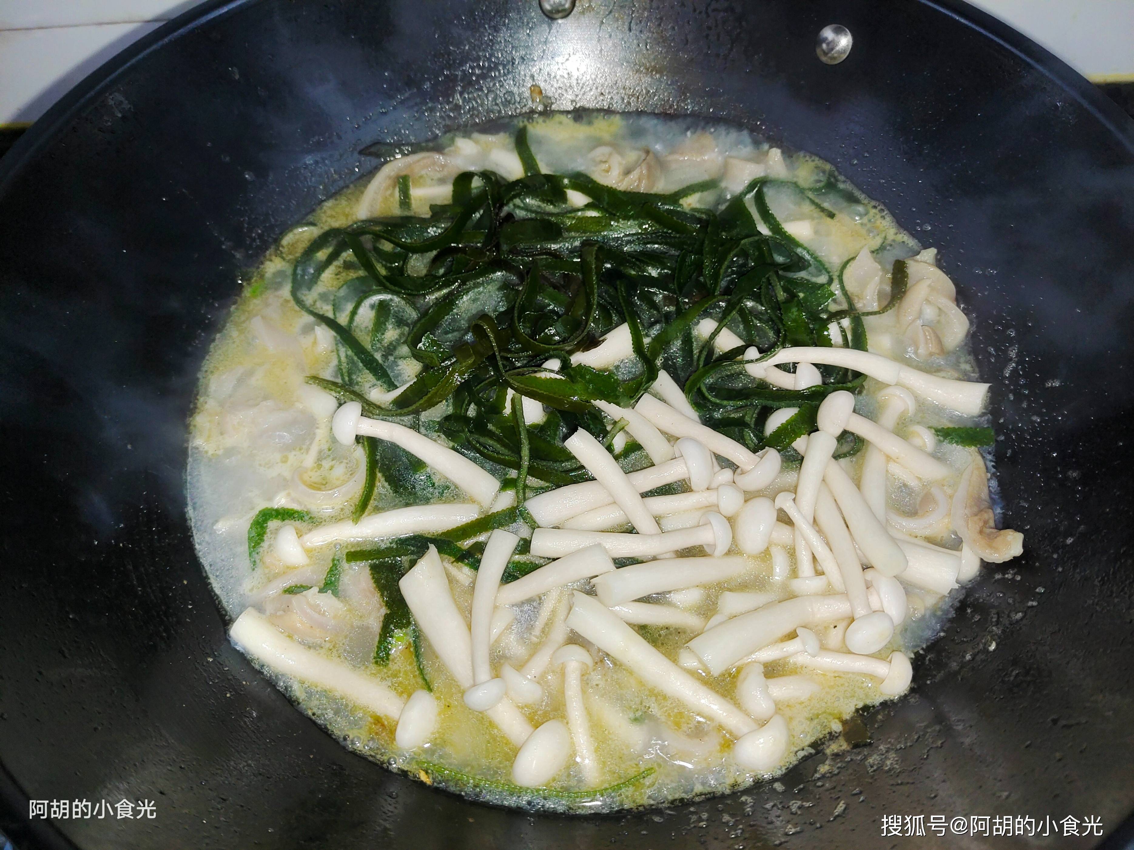 第四步:准备一些开水直接倒入锅中,也可以用高压锅压猪肚的原汤。而后就保持最大火煮一煮,让汤汁微微泛白一些。再把海带丝和白玉菇也倒入锅中,调味就来一些白胡椒粉、食盐和鸡精即可。就这样大火炖煮十分钟左右。