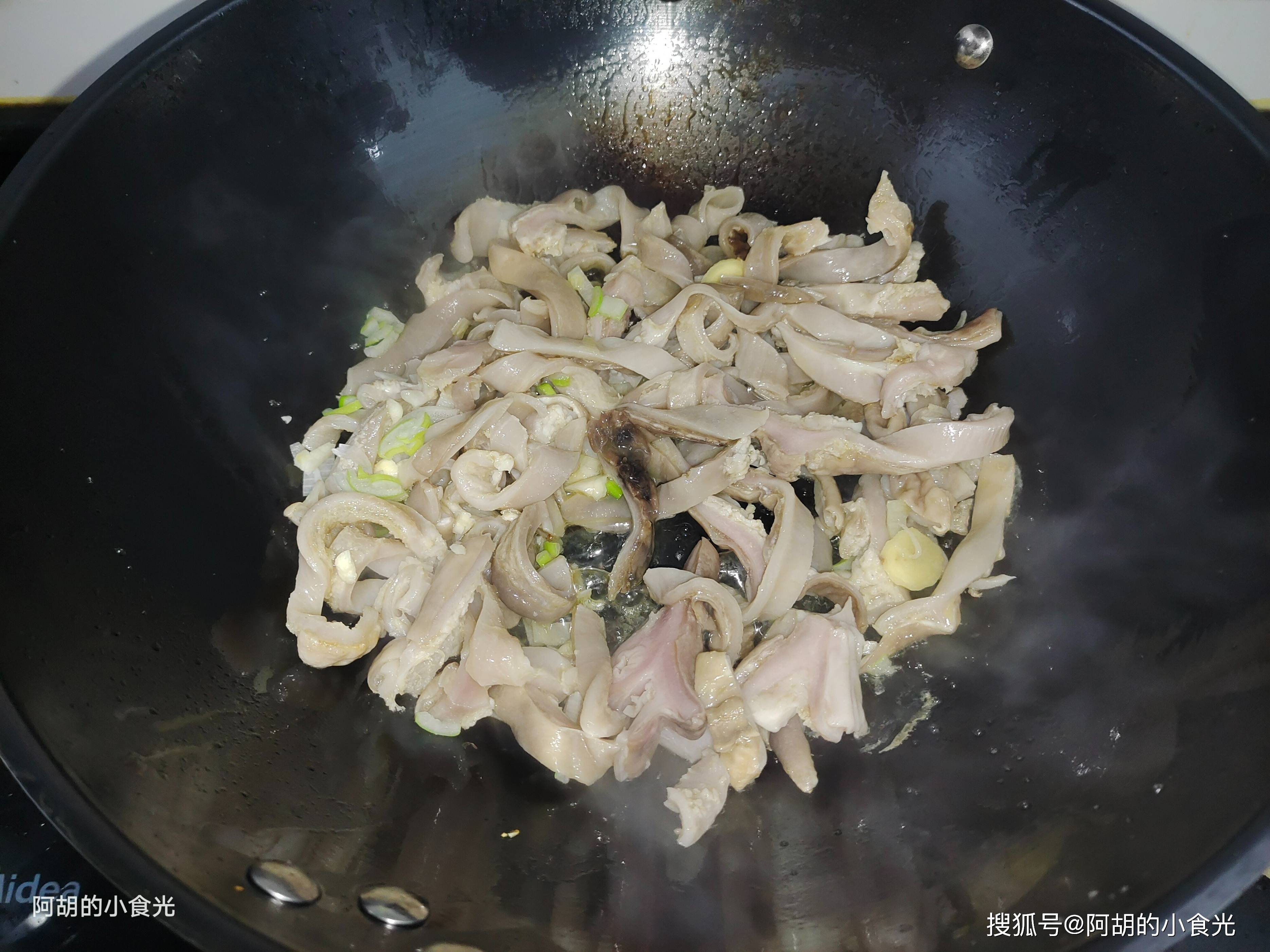 第三步:所有食材都已备好,下面就是开火烹饪。先把锅烘干,淋入一些菜籽油后小火烧热,先把猪肚条倒入锅中炒一炒,再把小料葱姜蒜倒入锅中一块炒一炒,炒出食材的鲜香味。