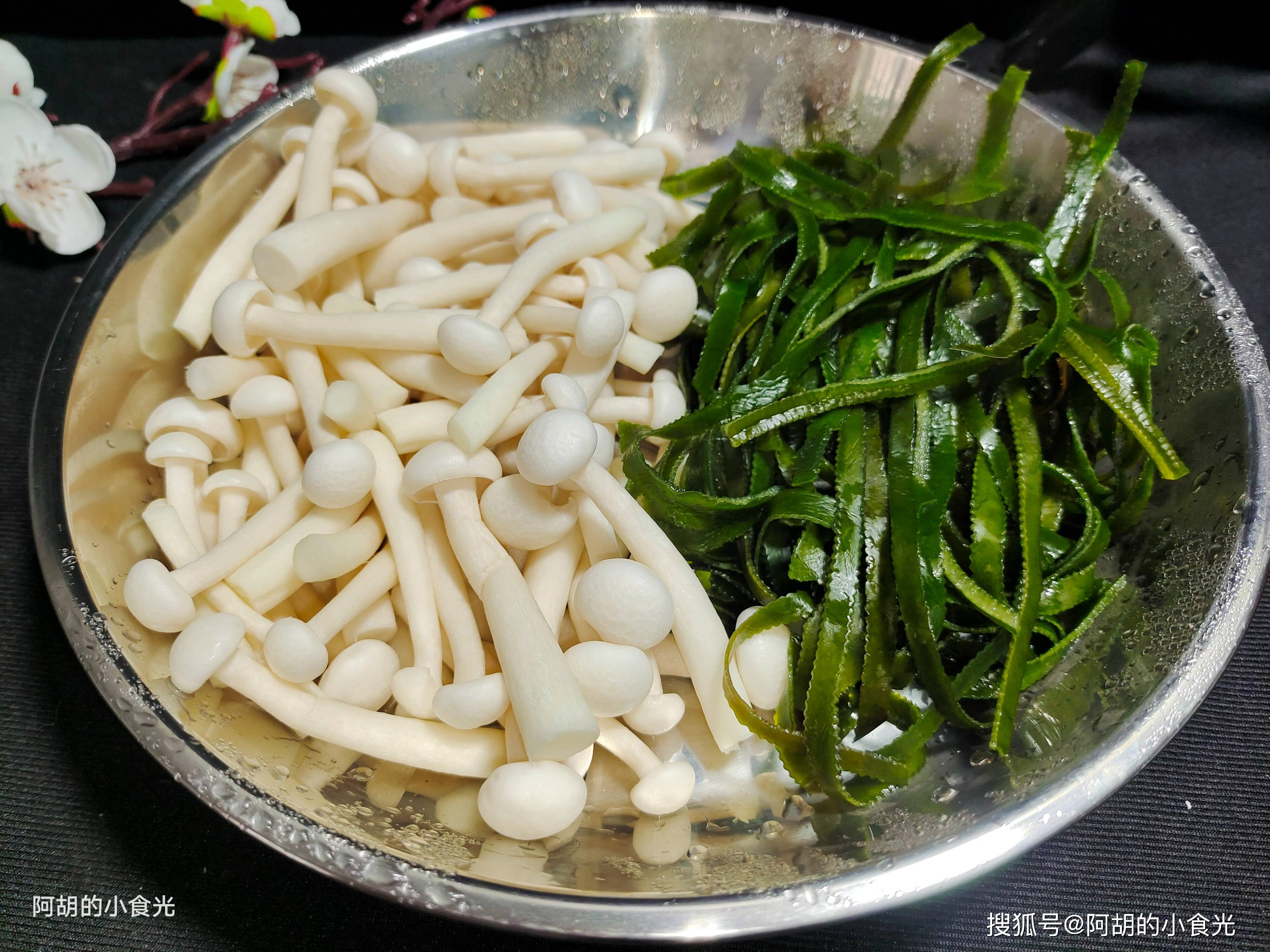 第二步:与猪肚搭配的食材就两样,一个是白玉菇,另一个就是海带丝。海带丝是干的,需要用凉水浸泡一个小时左右,还要焯水一次,帮助去除一些海带的土腥味。白玉菇最好也焯水一次,两者捞出后挤干水分待用。
