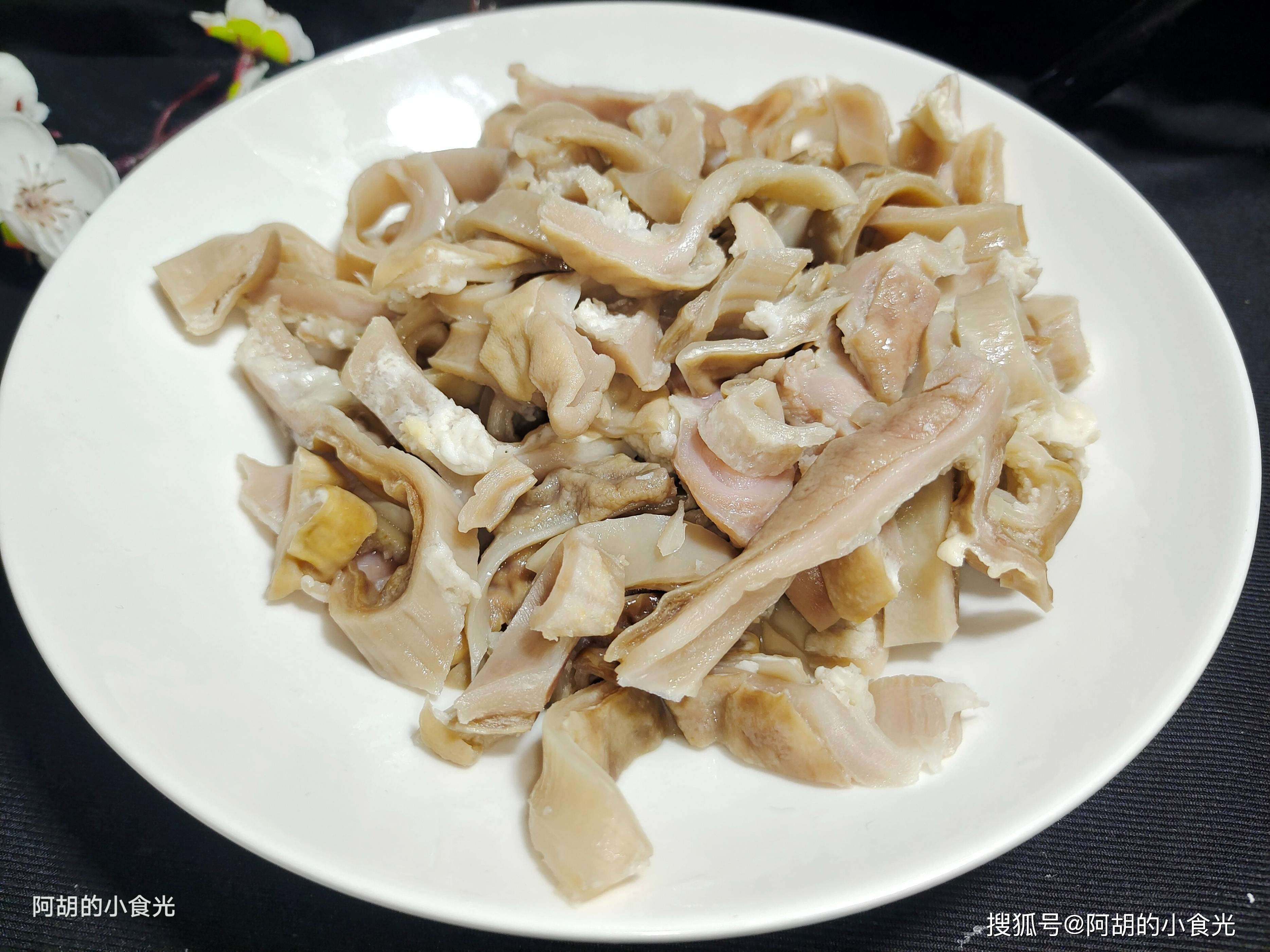 第一步:这个猪肚条是我提前煮好备好的,用来烹饪这道菜很方便。如果是新鲜的猪肚,则要用面粉和白醋多多地搓洗,还要把猪肚翻过来搓洗,洗掉猪肚附着的黏液部分。而后还要焯水,焯水后捞出要再次清理一番表面,洗干净后再加入高压锅中,加入一些葱姜压个20分钟左右,捞出后再切成猪肚条备用。