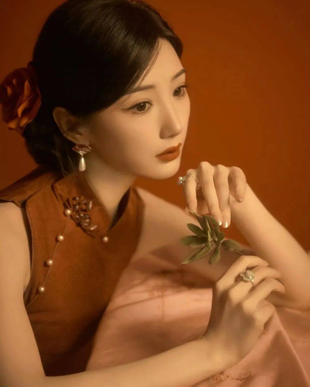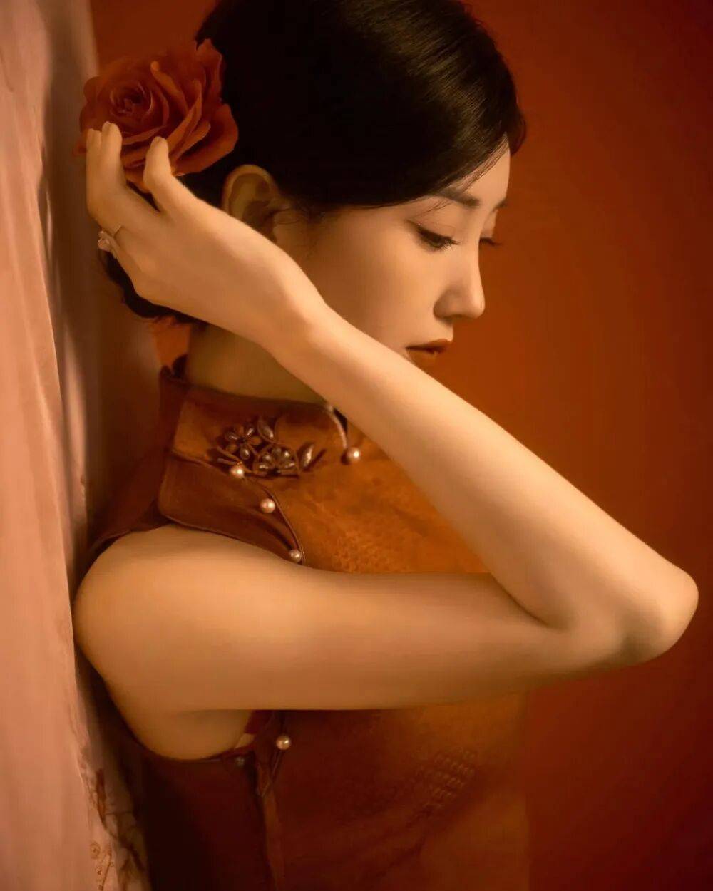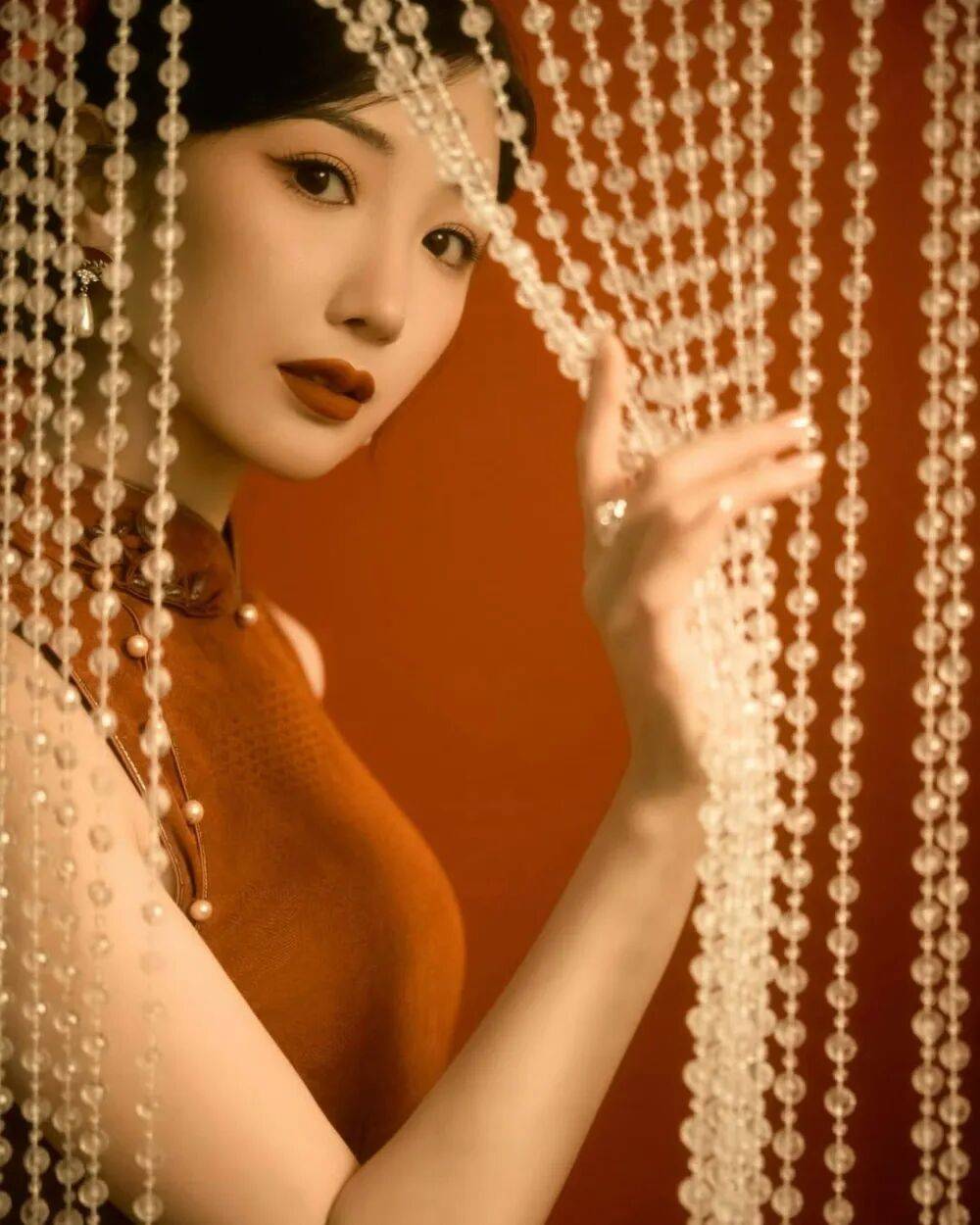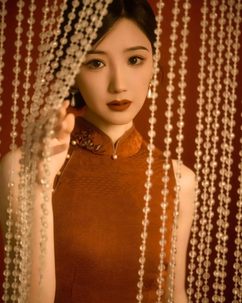 毛晓彤的旗袍大片像从泛黄的老照片里走出来的民国美人——她斜倚在雕花木窗前,复古红棕丝绒旗袍裹着玲珑身段,盘扣缀着的珍珠泛着温润光泽,耳垂下的翡翠坠子随动作轻晃,发髻间别着的玉簪斜斜挑着,眉眼低垂时,仿佛连空气里都飘着旧时光的沉香。