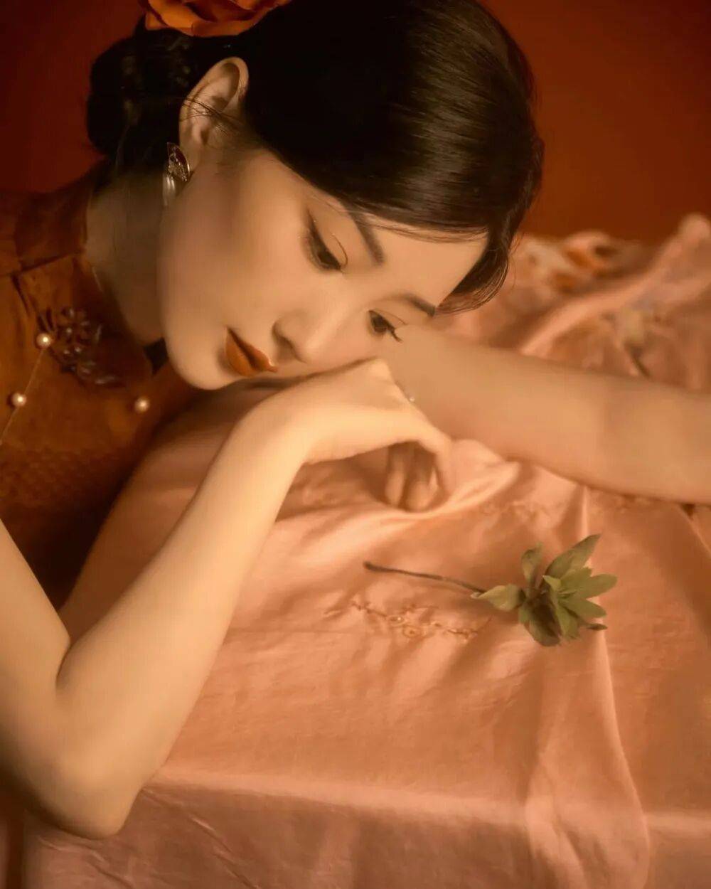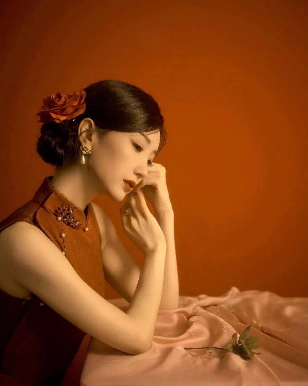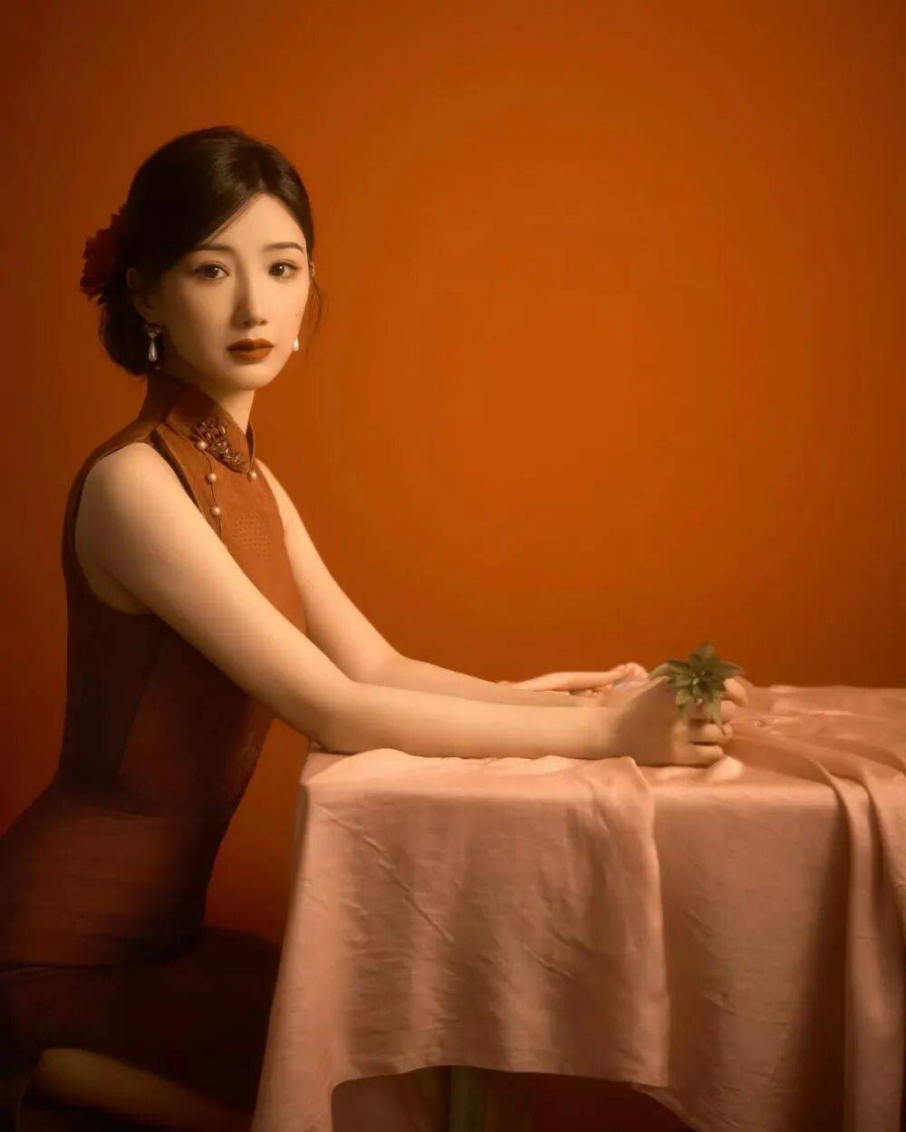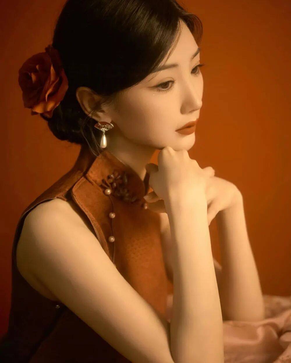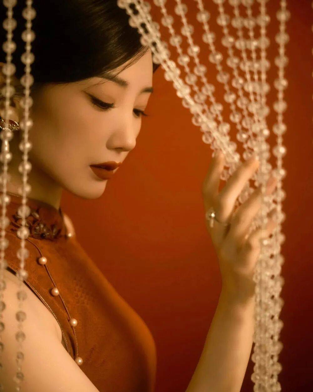 毛晓彤的旗袍大片像从泛黄的老照片里走出来的民国美人——她斜倚在雕花木窗前,复古红棕丝绒旗袍裹着玲珑身段,盘扣缀着的珍珠泛着温润光泽,耳垂下的翡翠坠子随动作轻晃,发髻间别着的玉簪斜斜挑着,眉眼低垂时,仿佛连空气里都飘着旧时光的沉香。