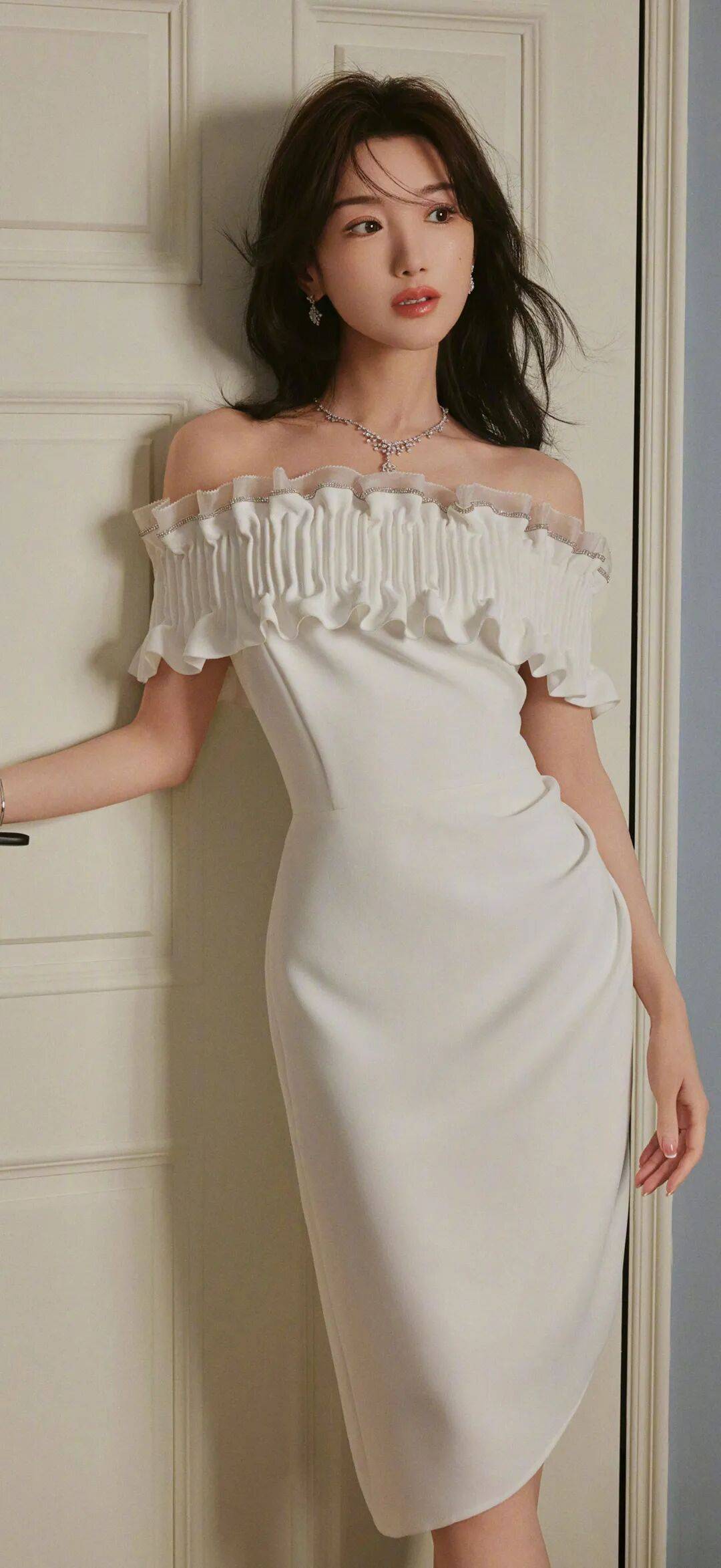 再瞧瞧这深V的设计,简直是神来之笔!深V领口巧妙地拉长了颈部线条,让她的脖子看起来又细又长,就像优雅的天鹅颈。而且,深V还若隐若现地露出她精致的锁骨,那锁骨线条清晰又优美,感觉都能在上面放硬币了,这骨相美得太绝了!同时,深V又增添了一丝小性感,不是那种俗气的暴露,而是一种含蓄又撩人的魅力,让人忍不住想多看几眼。