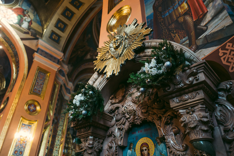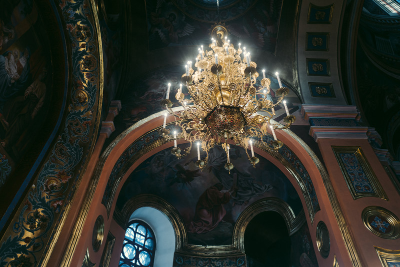 轻声的推开厚重的木门,走入教堂内部。教堂的天顶很高,室内静得简直同 贝加尔湖 至深处无异,如此的氛围令呼吸都变得小心翼翼。前厅悬着巨大璀璨的金色吊灯,泻下白色的光粒子,照亮脚底的通路。 教堂内部的装饰极尽人们所能想象到的辉煌,墙壁与屋顶都绘饰着耶稣、 玛利亚 、使徒和大天使。据称集结了众多当时著名的圣像画家、银匠、镀金匠和雕刻家耗费多年精力才得以完成。