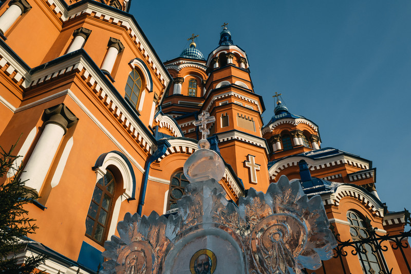 圣光照耀,喀山圣母堂 清晨时分,我们离开 贝加尔湖 ,当再次回到 伊尔库茨克 的街市,已是午后。 汽车经过安加拉河。河面并未结冰,泛起一派蒸腾的雾气,景色略带寒意。想下车沿着河岸走一走,城市中的河流于我有着别样的吸引力,胡乱觉得与时光、浪漫之类的字眼脱不开联系,总想亲近。 愿望没能实现,但目的地不逊于河景。 喀山 圣母大教堂,伊尔库兹克市区最大的东正教堂,无论是外观还是内在,都只能用无比华丽来形容。她像镶嵌在伊尔库王冠上的瑰宝,召唤着每一位旅人前来仰望。