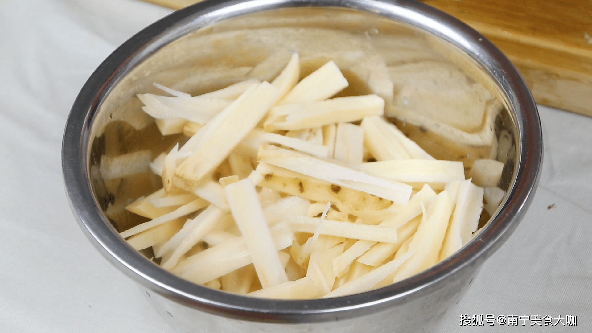 莲藕去皮后切成薄片,再切成细丝,并用淡盐水浸泡10分钟以去除淀粉和防止氧化变黑。