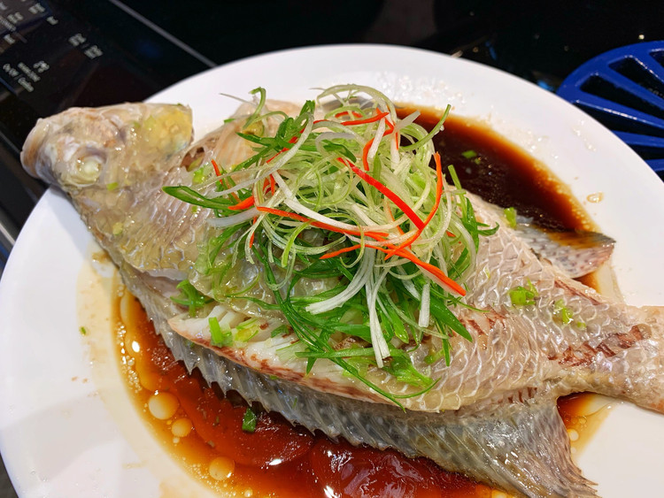 将蒸好的鱼取出,去掉姜片和小葱,将炒好的料汁均匀淋在鱼身上,撒上葱花即可。