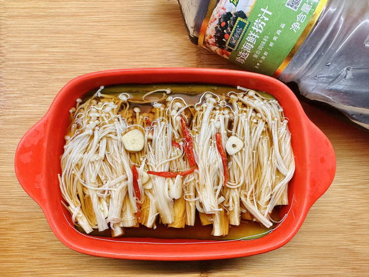 另起一锅,将金针菇烫熟后捞出,铺在碗底。