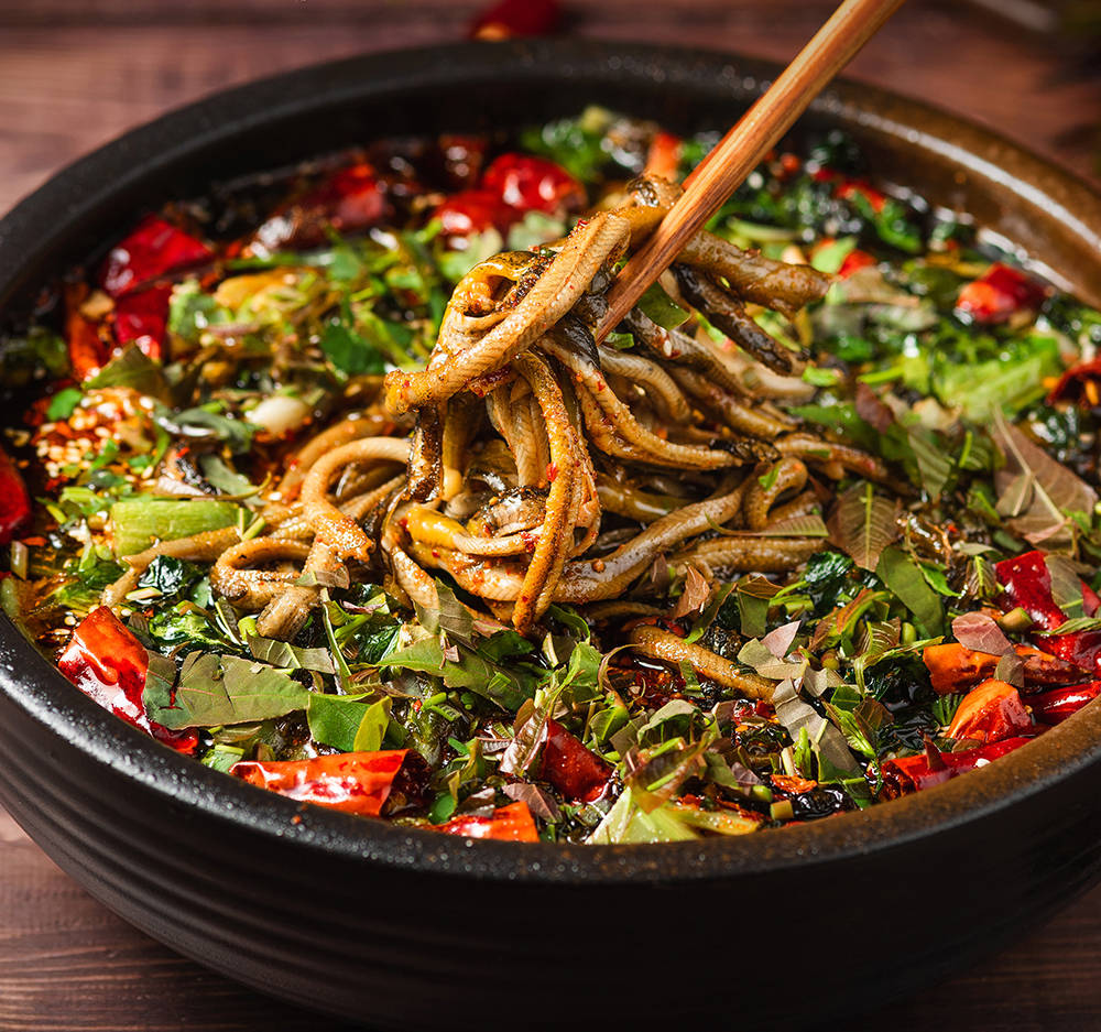 临江鳝丝的独特之处在于其闷杀技法,这种技法能够在短时间内将鳝鱼煮熟,同时保持肉质的完整性和弹性。在烹饪过程中,活黄鳝直接倒入沸水中用大火煮,煮的火候和时间控制得恰到好处,既能保证鳝鱼去骨后仍能拉成丝状,又能确保肉质的鲜嫩。