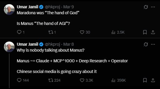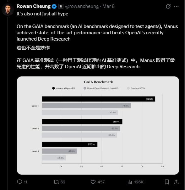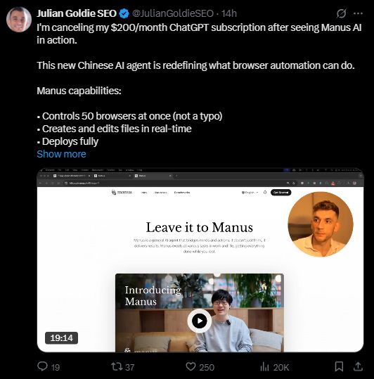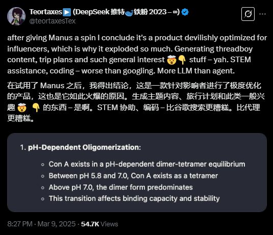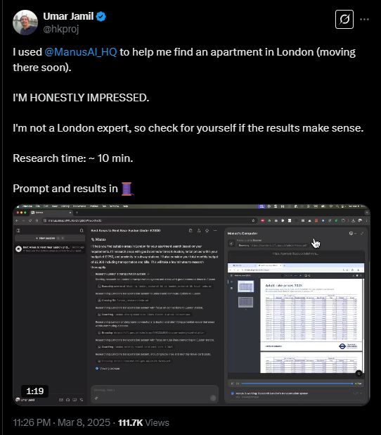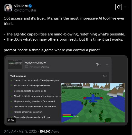 Manus终于火到海外了。 上周,Manus横空出世,以全球首款通用AI Agent在国内社交媒体上刷频。但爆火同时也被质疑存在过度营销之嫌,其中一大质疑是,Manus的“爆火”主要局限于国内,在海外却无人问津。 而这个周末,Manus开始破圈了,福布斯等主流媒体开始关注,也成为海外科技博主热议话题,一众科技大佬纷纷展开测评,有媒体称热度甚至赶超流行音乐女王霉霉的演唱会。 热议之下,Manus获得不少好评。比如知名AI博主Rowan Cheung称之为中国的“第二个DeepSeek时刻”,Hugging Face的产品负责人称Manus是他尝试过的“最令人印象深刻的AI工具”。 不过,也有用户在测试中发现体验并不顺畅而持保留态度。 世界上第一个完全自主的AI代理 3月8日,福布斯文章称,Manus这个来自中国的AI代理正在改变一切。 福布斯称Manus是一个能够独立思考和行动的革命性AI代理,重新点燃了一个已经持续了几十年的辩论:当人工智能不再寻求许可,而是开始自己做决定时,会发生什么? 在福布斯看来,Manus不仅仅是一个聊天机器人,也不是一个披着未来主义品牌的改进搜索引擎。它是世界上第一个完全自主的AI代理: 知名AI博主、曾专访扎克伯格并率先发布Llama-3开源消息的Rowan Cheung转发了Manus的官方视频,并将Manus比作“中国的第二个DeepSeek时刻”,并预测其进入美国市场只是时间问题。 这是Rowan首次发文讨论Manus。目前,这条推文评论接近600条,浏览量超260万。 Rowan在评论里介绍了自己的体验经过。在收到邀请码后,他先测试了Manus创建个人传记并基于此传记部署网站的能力。Manus通过他的社交渠道、浏览文章,并成功部署了网站,且信息100%准确,包括最新的信息。 接下来,Rowan测试了Manus在提供实用信息方面的表现,例如寻找旧金山最佳租车地点,要求满足低犯罪率、大量人工智能活动和高密度的雄心勃勃的年轻企业家。Manus提供了4个非常准确的选项。 Rowan进一步测试了Manus完成长时间研究任务的能力,要求它创建一门关于内容创作人工智能的完整课程。Manus花了近2个小时完成,最终提供了一门包含8章的课程,其中包含工具、用例和提示示例。 一番体验下来,Rowan认为Manus“并不全是炒作”。 专注于搜索引擎优化(SEO)的X用户Julian Goldie直言,在看到Manus的实际效果后,他取消了每月200美元的ChatGPT订阅,他认为Manus正在重新定义浏览器自动化的功能。 经过测试,Goldie总结了Manus的强大功能:能够同时控制50个浏览器、实时创建和编辑文件、部署功能齐全的网站…… 不仅如此,Goldie认为Manus在效率提升和成本节约上都能“秒杀”竞争对手,不仅在研究方面比任何竞争对手都更快,能够快速生成综合报告和可视化效果,而且使用Manus可以节省数千美元。 Hugging Face的产品负责人Victor M测试了Manus的代码生成功能,展示了Manus编写的一个使用Three.js库控制飞机的游戏。 Victor M大为惊叹,称他尝试过的“最令人印象深刻的人工智能工具”。他表示,Manus的用户体验(UX)是许多其他工具承诺过的,但Manus真正实现了。 X用户Umar Jamil分享了使用了Manus 来帮他在伦敦找房子的过程,他对Manus推荐的社区非常满意,并且很快就要搬过去了。 Umar Jamil的需求是在伦敦找到一个公寓,要求通勤时间不超过一小时,租金不超过1750英镑,至少有一间卧室和一个大客厅。 Manus 花了大约10分钟内完成了研究任务,通过创建一个待办事项列表来构建研究计划,并将所有中间结果保存在文件中,随着找到更多信息不断编辑这些文件。它会浏览互联网,寻找所有与研究相关的有用信息。 最后,Manus 推荐了几个区域,并推荐Walthamstow Central为最佳选择,因为它通勤时间仅为17分钟,租金在1300至1700英镑之间,且在预算内有较大的居住空间。 找到满意房子后,Umar Jamil连发数条推文表达他的震撼,称Manus ~= Claude + MCP*1000 + Deep Research+ Operator,还发问:“马拉多纳是‘上帝之手’,Manus会是‘AGI之手’吗?” 耗时太长、信息不准...吐槽也不少 Manus在海外的快速崛起也伴随着争议,一些用户和专家对其技术成熟度提出质疑,也有一些早期用户表示体验Manus的过程并不顺畅,而且存在一些事实性错误。 AI初创公司Pleias的联合创始人Alexander Doria在测试Manus时遇到了错误信息和无限循环的问题。 Jackson Laboratory 教授Derya Unutmaz对比了OpenAI的Deep Research和Manus的性能。 Deep Research在不到15分钟内完成了任务,而Manus AI在运行50分钟后,在步骤18/20时失败了。 Unutma观察了Manus AI的输出,认为其表现相当好,并进行了第二次尝试。但第二次尝试在20分钟后,在步骤9/20时也失败了,Unutma推测可能是Manus AI的服务器过载。 也有用户指出,Manus在事实性问题上会犯错误,并且并不总是引用其工作来源,有时会遗漏很容易在网上找到的信息。 X用户Teortaxes认为Manus是一个针对社交媒体影响者极度优化的产品,这解释了它为何如此受欢迎: 该产品在生成主题内容、旅行计划等一般兴趣方面表现良好,但在STEM领域协助和编程方面表现不佳,甚至不如使用谷歌搜索。 Teortaxes提到Manus AI在处理某些任务时的输出质量不高,与将文档直接输入ChatGPT/Gemini相比没有太大优势,称之为“相当标准的GPT废话”。 TechCrunch记者Kyle Wiggers自己对Manus的体验也不太好。 他让Manus处理一个看似简单的请求:从他所在地区的顶级快餐店订购一份炸鸡三明治。大约十分钟后,Manus崩溃了。在第二次尝试中,Manus找到了符合他标准的菜单项,但无法