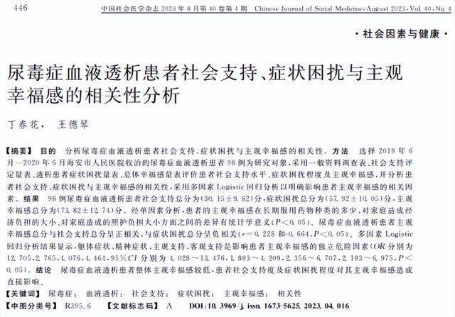 尿毒症血液透析患者社会支持、症状困扰与主观幸福感的相关性分析 丁春花;王德琴 中国社会医学杂志 2023-08-15