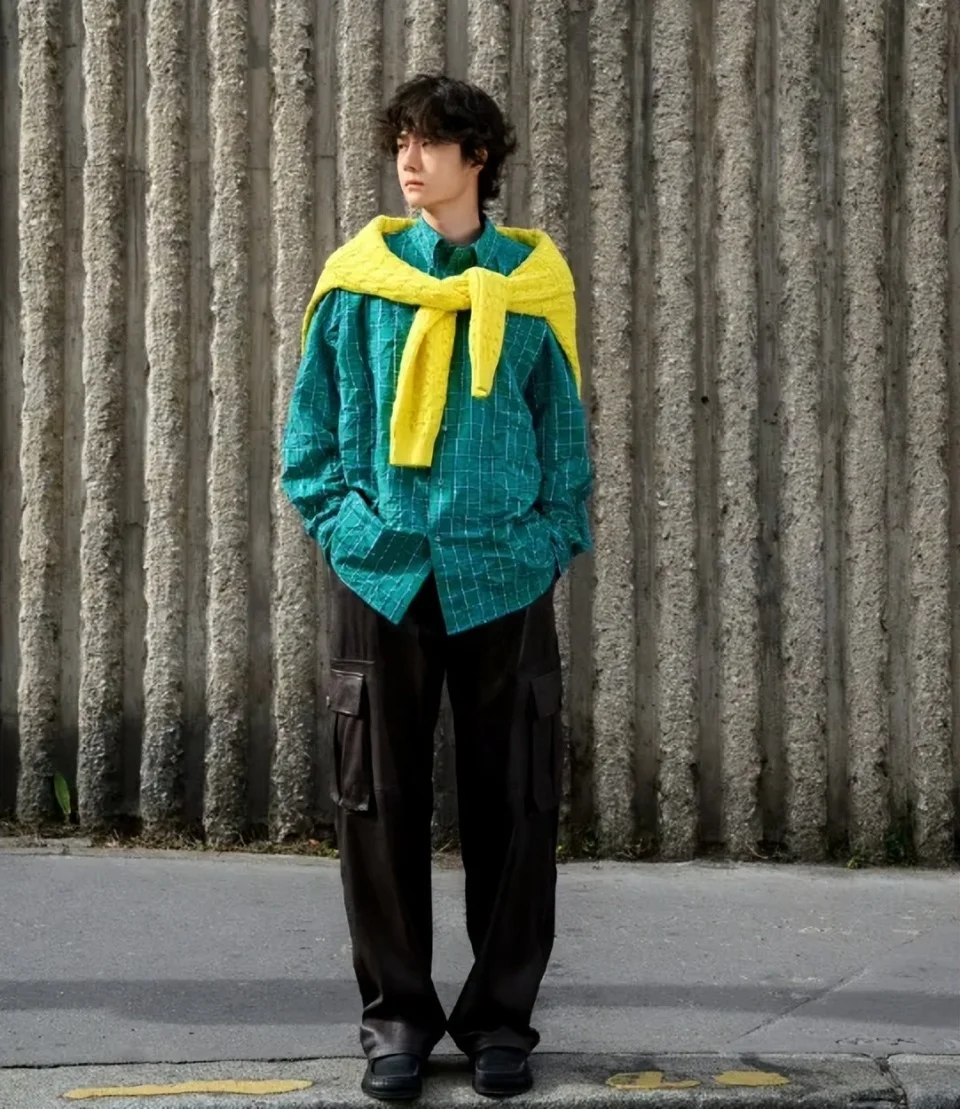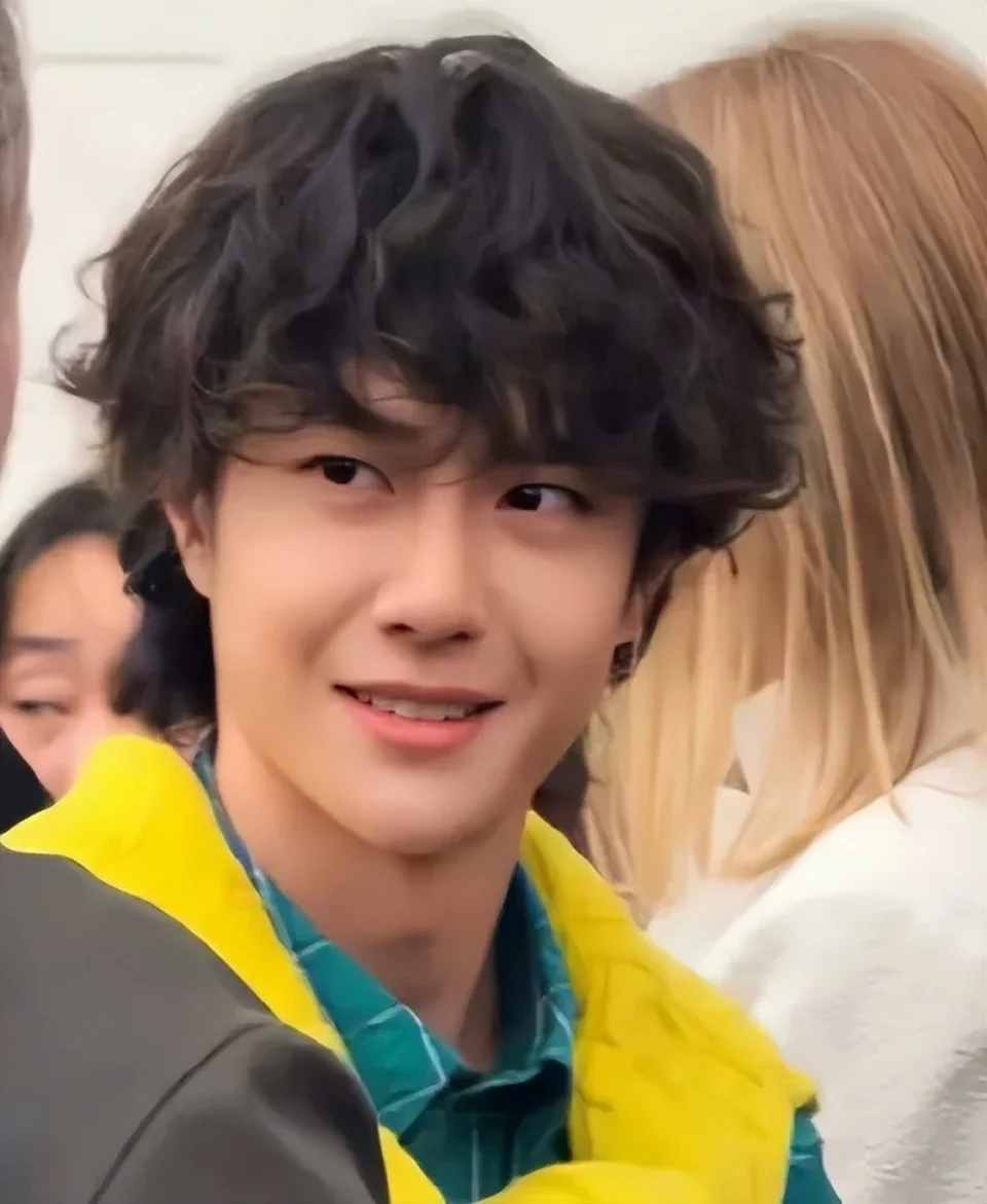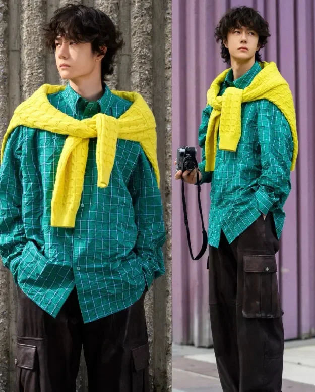 王一博化身卷毛小王子,蓝绿色格子衬衣搭配黄色毛衣,简单干净,还挺温暖有型的,尤其是再搭配着他这一头微卷的头发,有点子帅气。