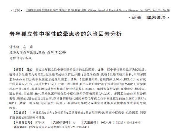 老年孤立性中枢性眩晕患者的危险因素分析,许冬梅;马诚,中国实用神经疾病杂志,2025-09-25