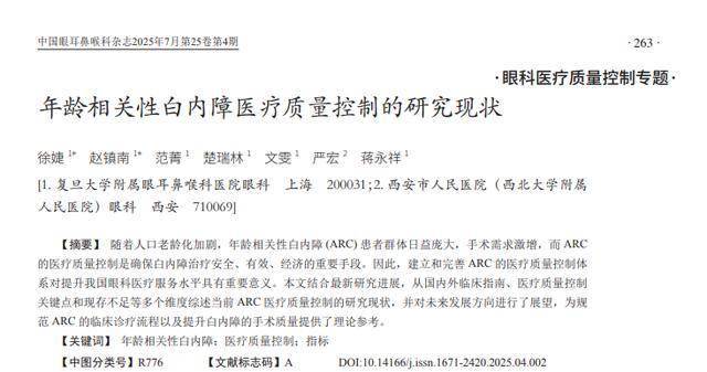 徐婕;赵镇南;范菁;年龄相关性白内障医疗质量控制的研究现状,中国眼耳鼻喉科杂志,2025-07-23