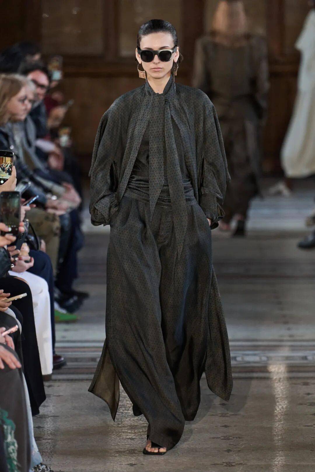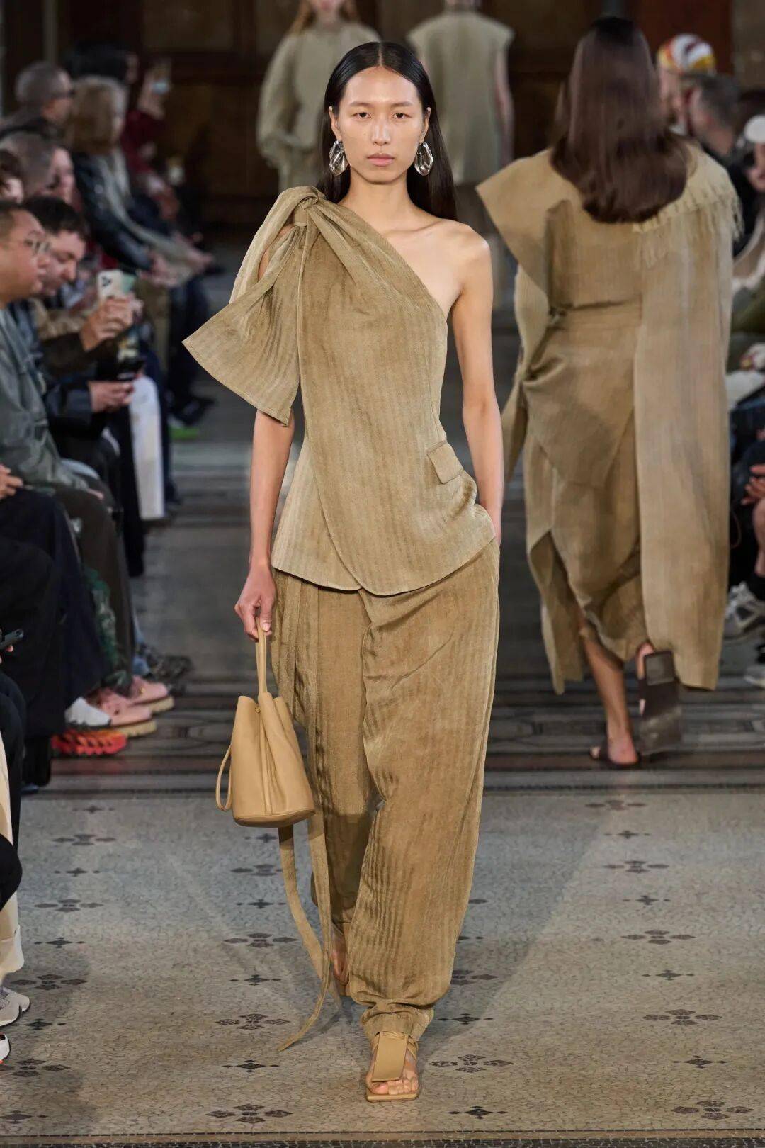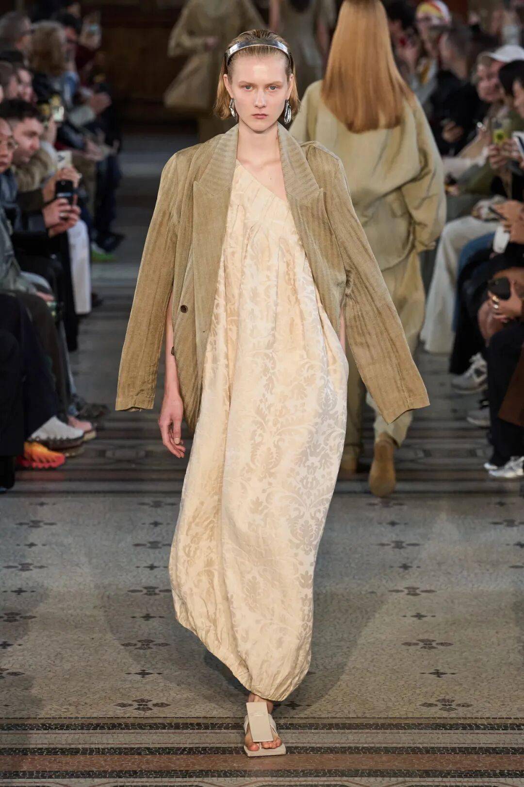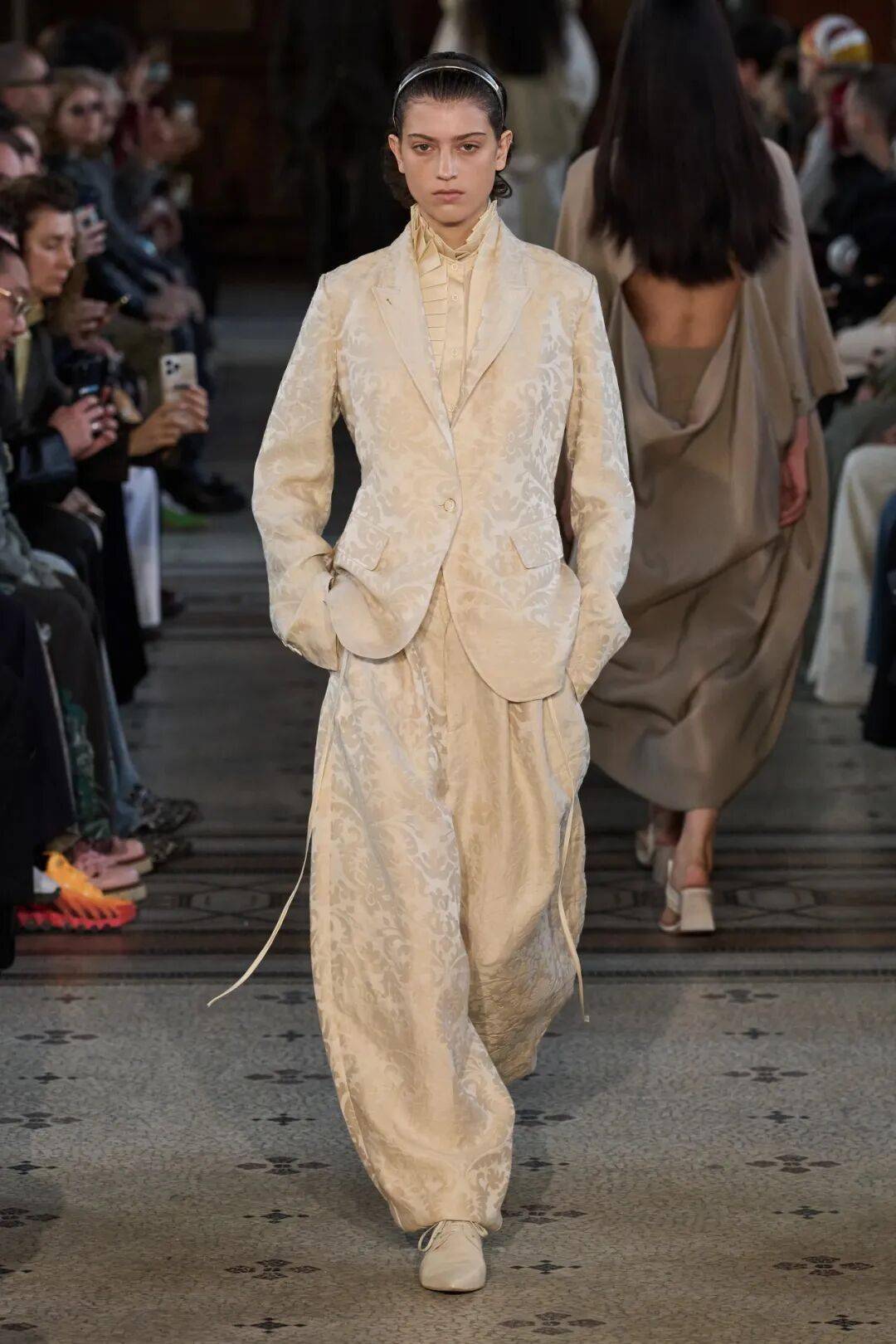 延续了品牌一贯的东方禅意设计风格,垂感的面料增添了服装的实穿性,大地色系的夹持又凸显了松弛感,为巴黎时装周带来了一次东方美学的“甜蜜暴击”。