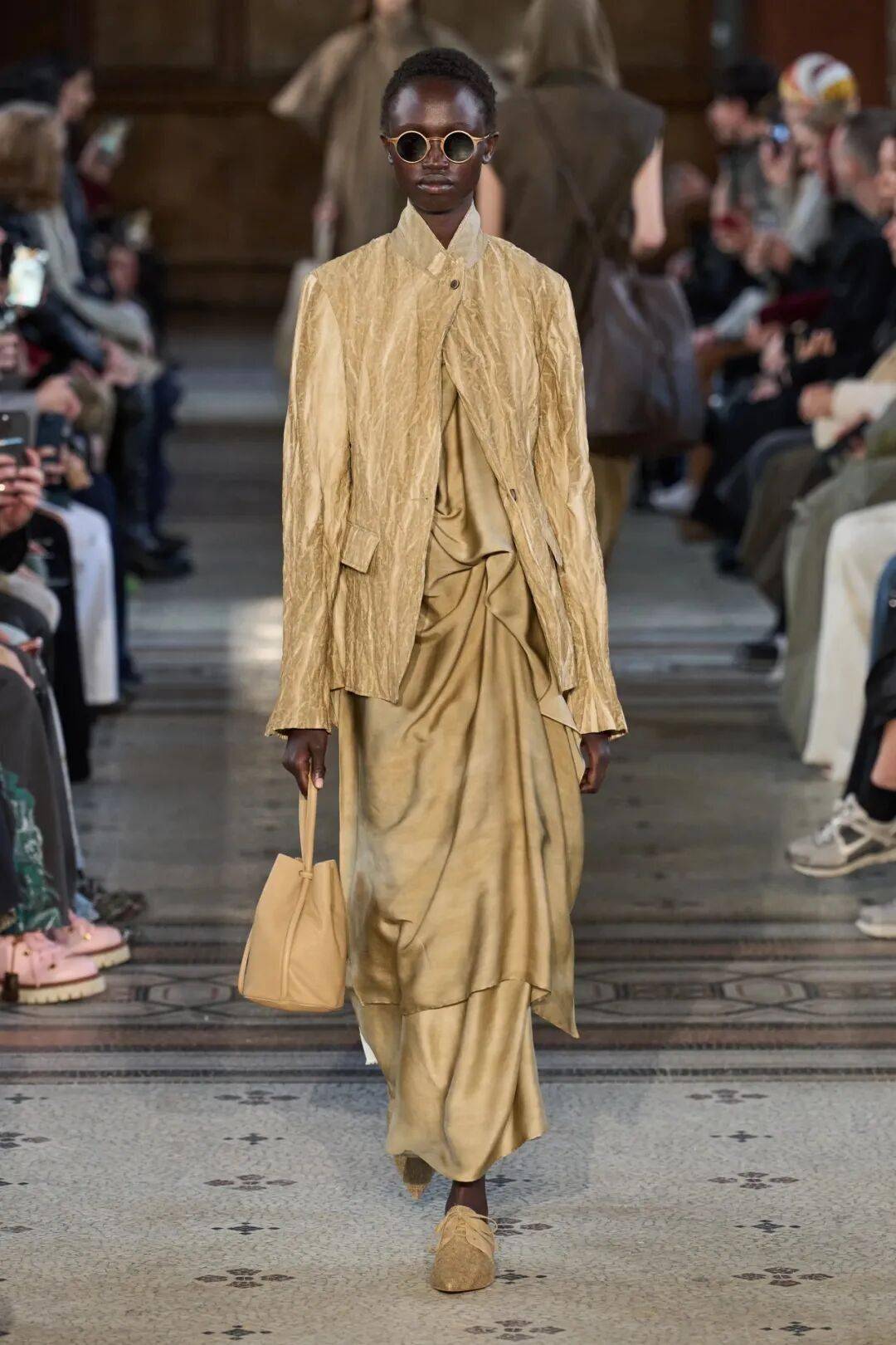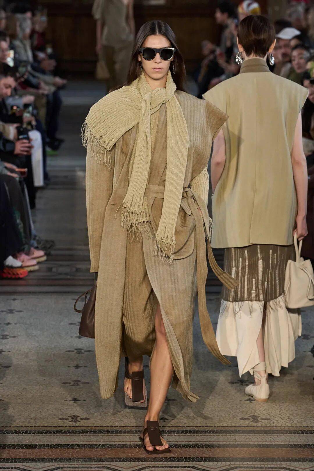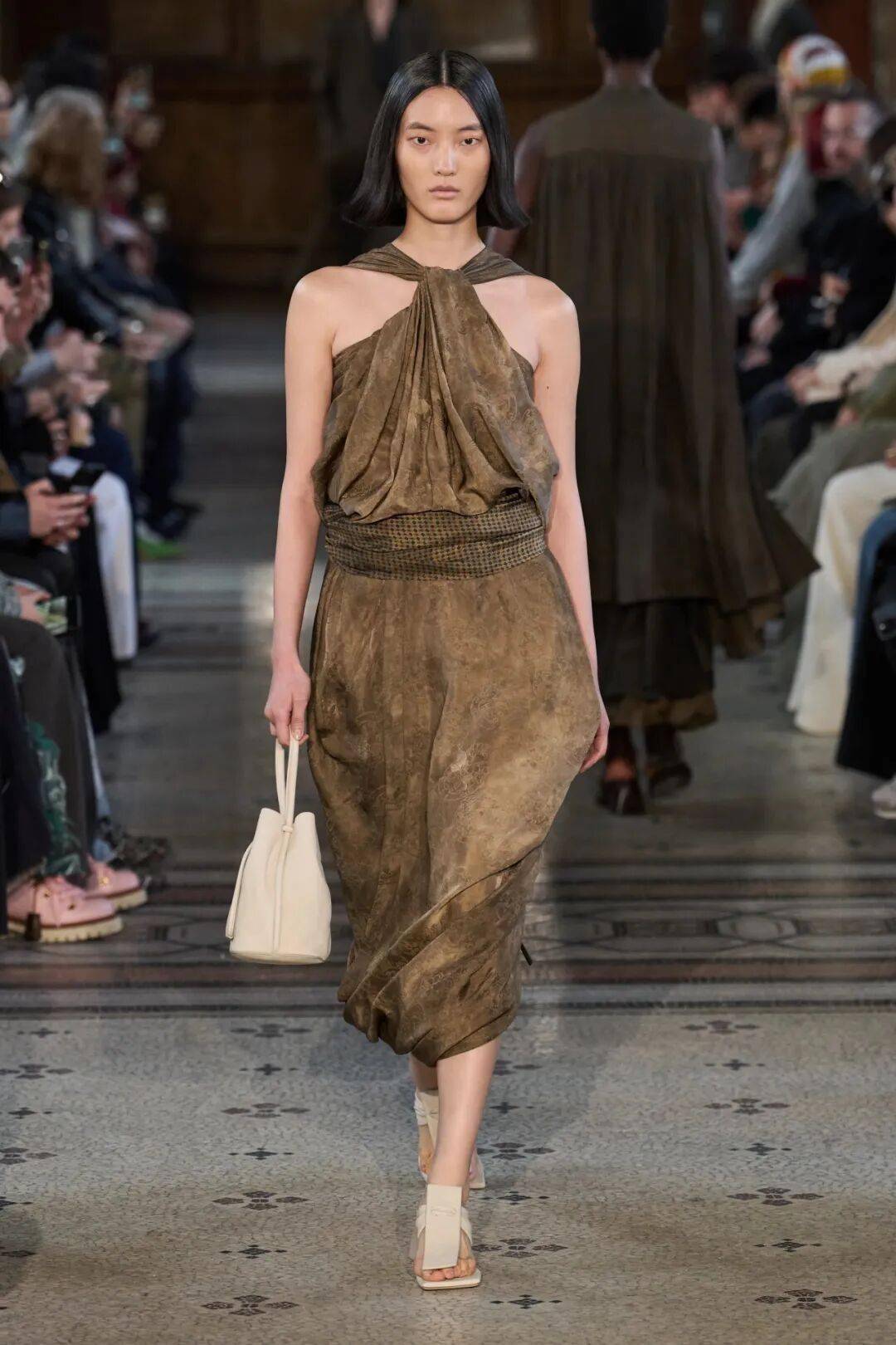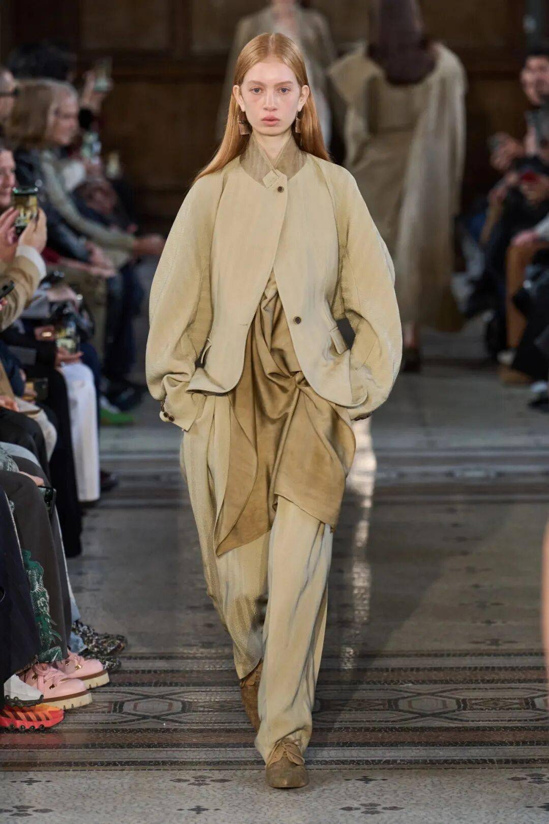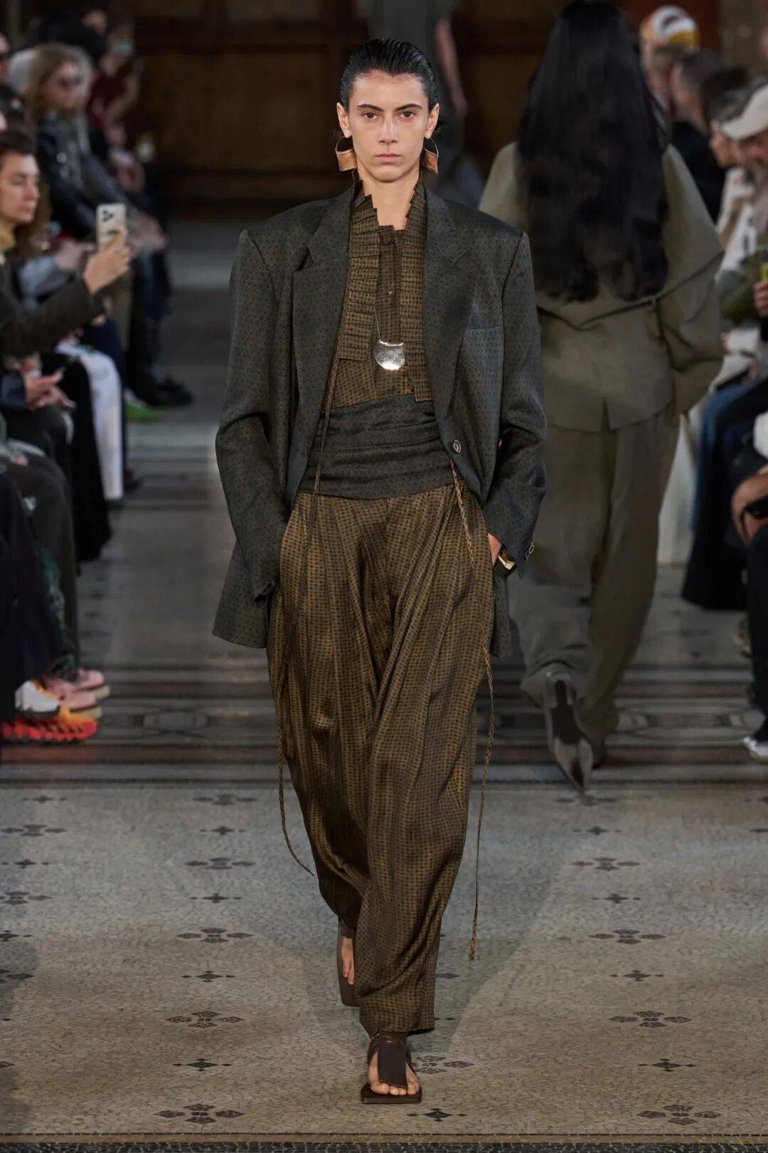 延续了品牌一贯的东方禅意设计风格,垂感的面料增添了服装的实穿性,大地色系的夹持又凸显了松弛感,为巴黎时装周带来了一次东方美学的“甜蜜暴击”。