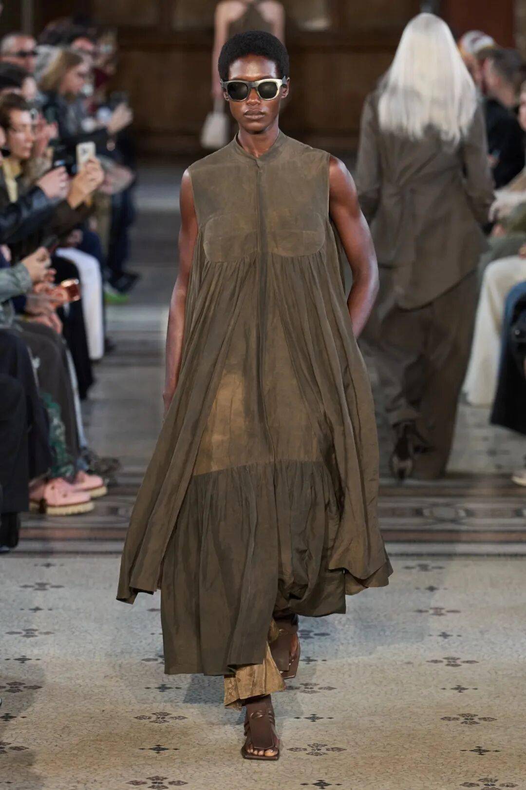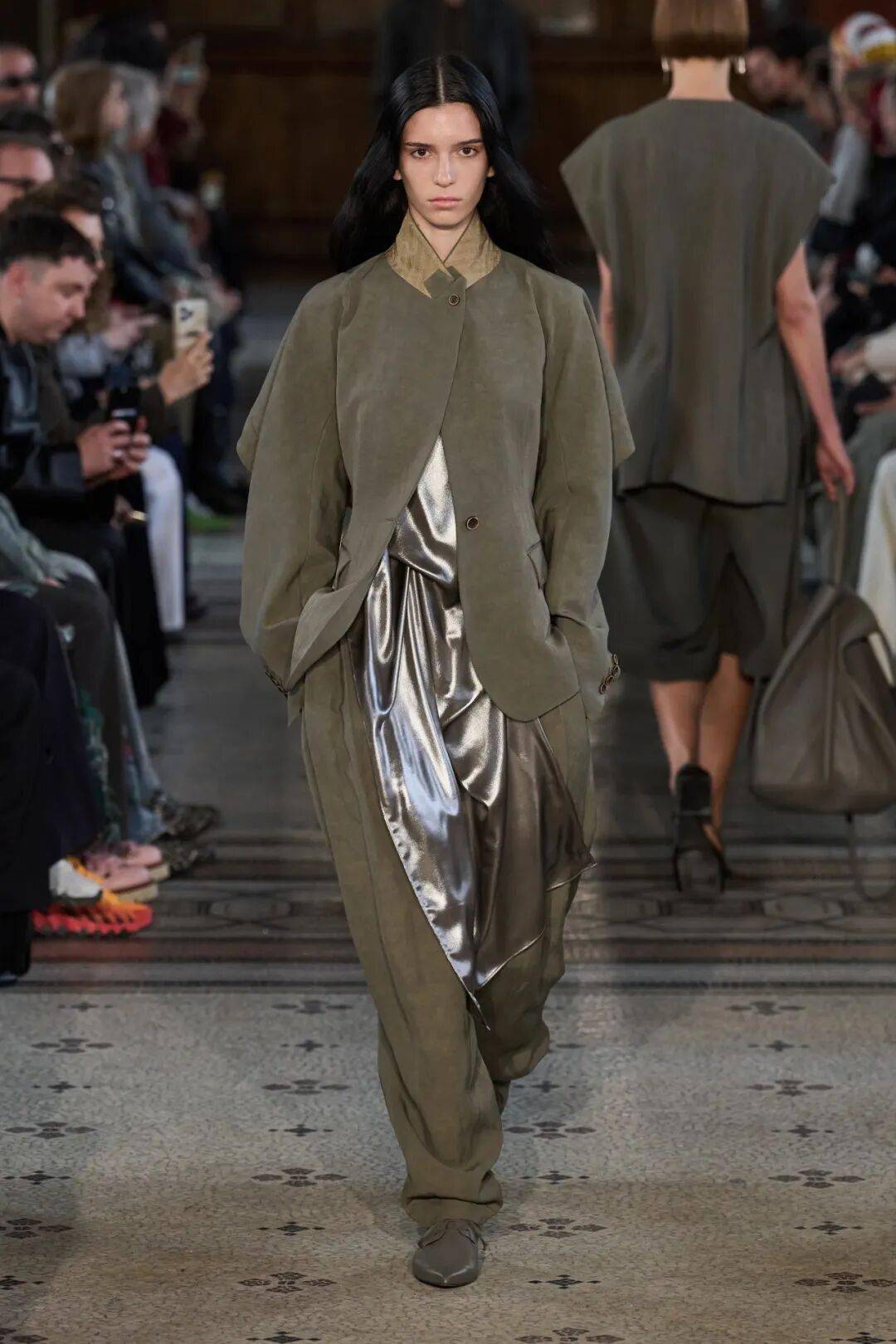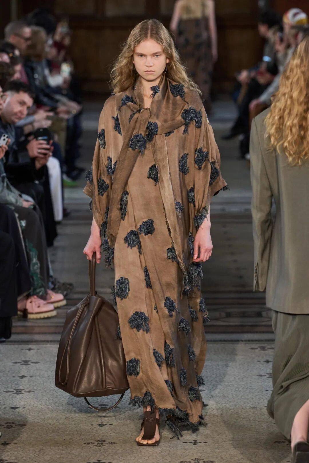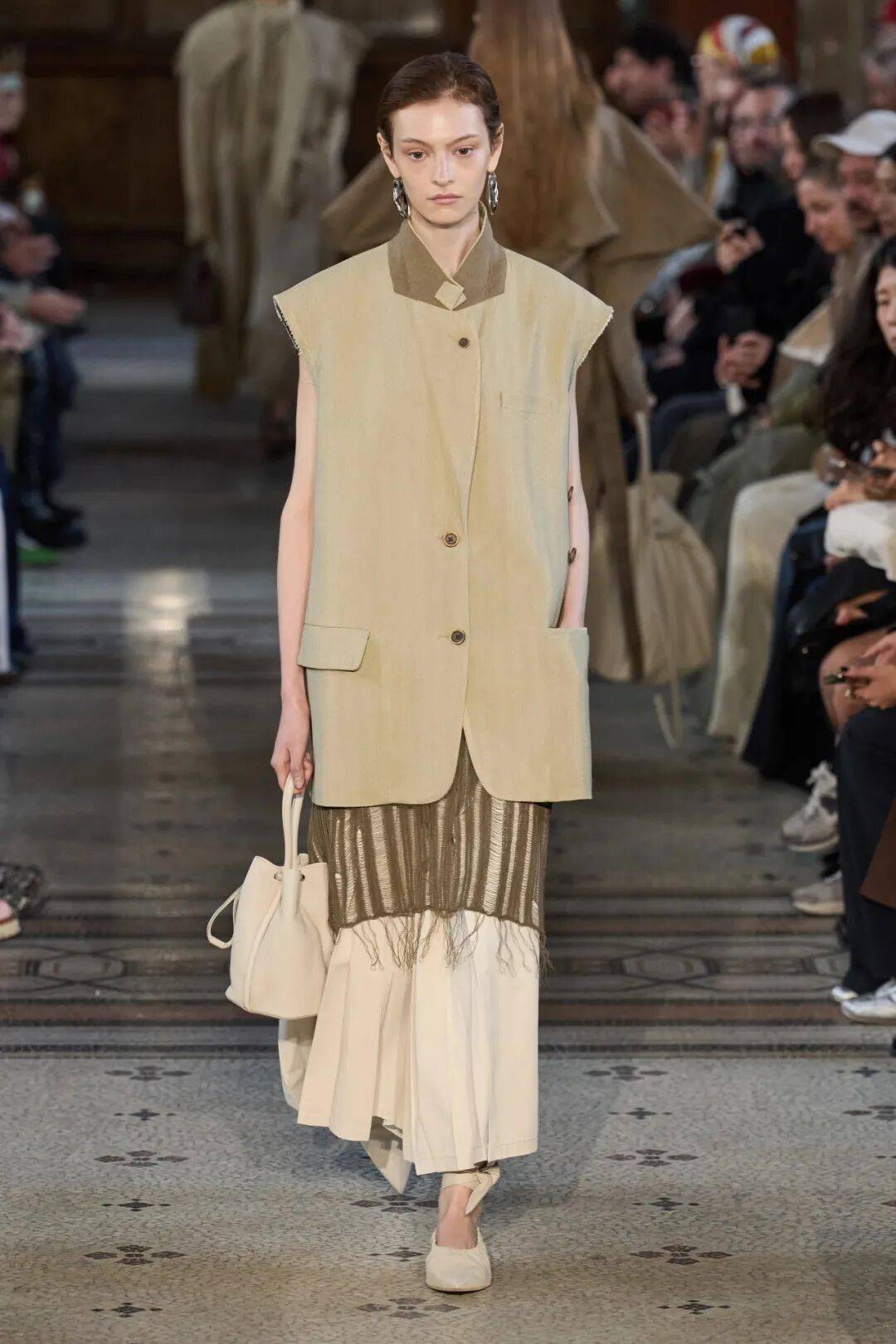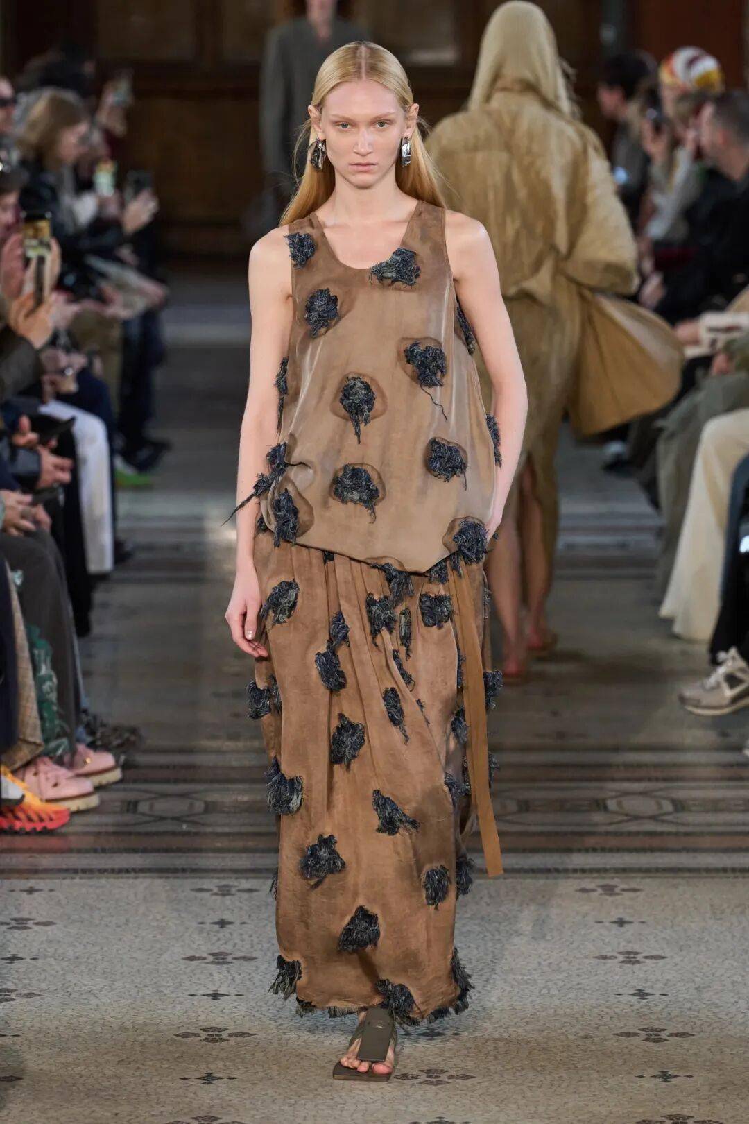 延续了品牌一贯的东方禅意设计风格,垂感的面料增添了服装的实穿性,大地色系的夹持又凸显了松弛感,为巴黎时装周带来了一次东方美学的“甜蜜暴击”。