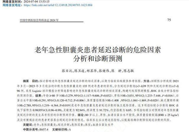 [1] 张日沅.老年急性胆囊炎患者延迟诊断的危险因素分析和诊断预测, 中国中西医结合外科杂志, 2024-07-04