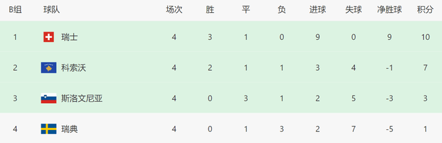 本场过后,瑞典队在B组的积分情况如下: