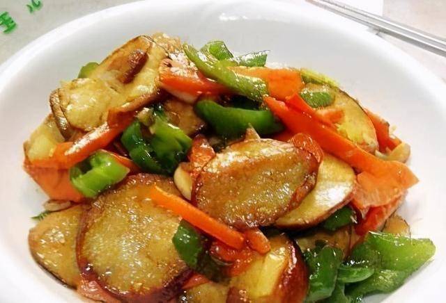 3 胡萝卜、辣椒放进去炒大概2分钟,水淀粉勾芡,撒上蒜末、鸡精出锅装盘即可。