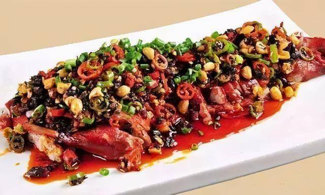 5、撒上红椒块、辣椒面、花椒和大葱,浇入9成热的色拉油便可上桌。