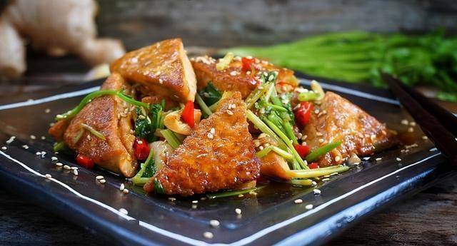 3、煎豆腐时,把小米椒、大蒜切碎,小芹菜切段,二面都要煎至金黄,煎好的豆腐取出来。