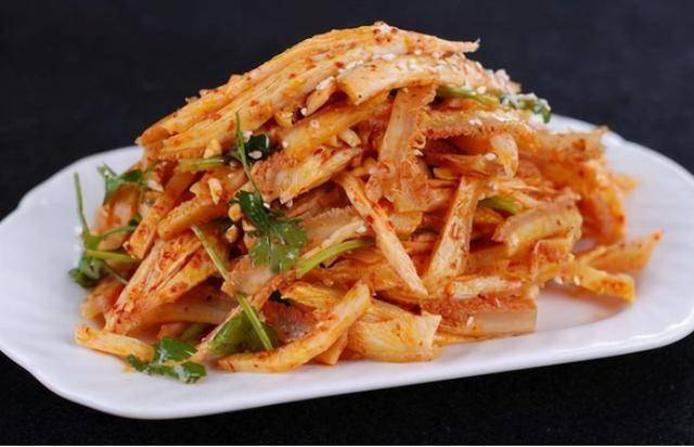 1、将皮肚改刀成饺形片,用鸡汤提前煨制入味;