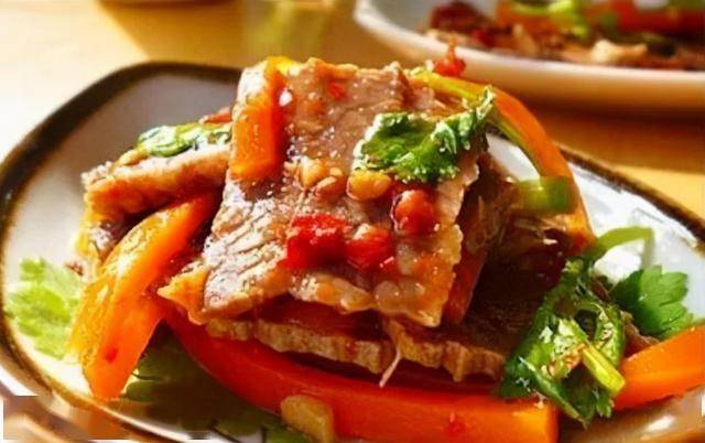 材料:牛肉、胡萝卜、香菜、辣椒酱、料酒、麻油