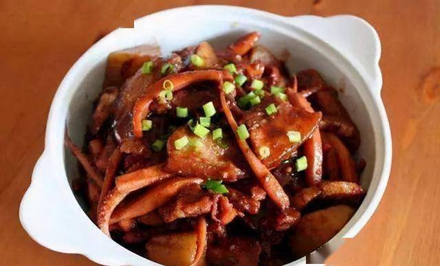 材料:鱿鱼干4个,五花肉500克,葱1小段,蒜薹100克,姜3片,大料3颗,桂皮1小段,香叶1片,老抽2大匙,生抽1茶匙,冰糖3颗,盐1小勺,植物油1勺