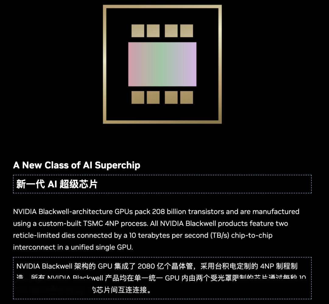 工艺/芯片制造:Blackwell芯片采用NVIDIA与TSMC合作定制的4NP工艺。