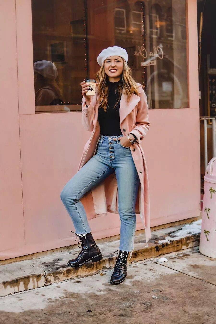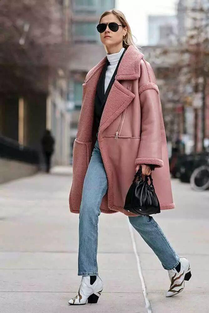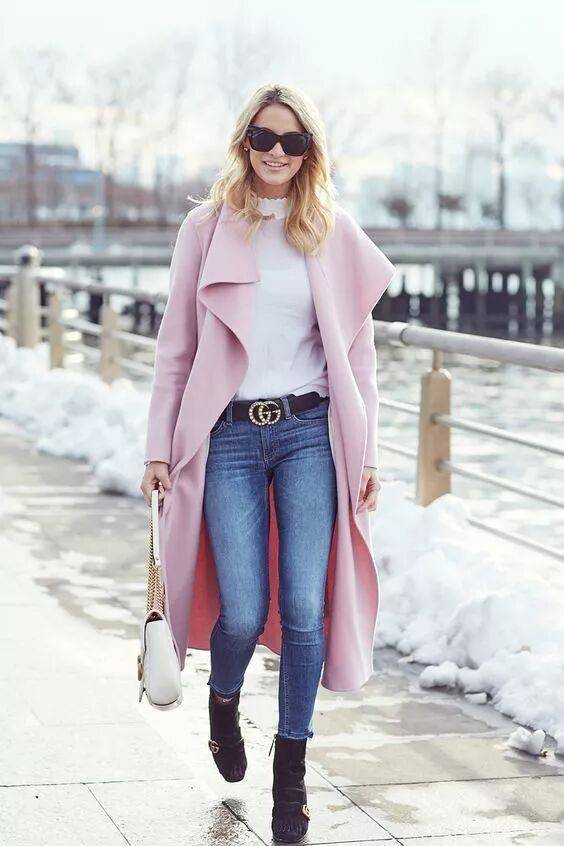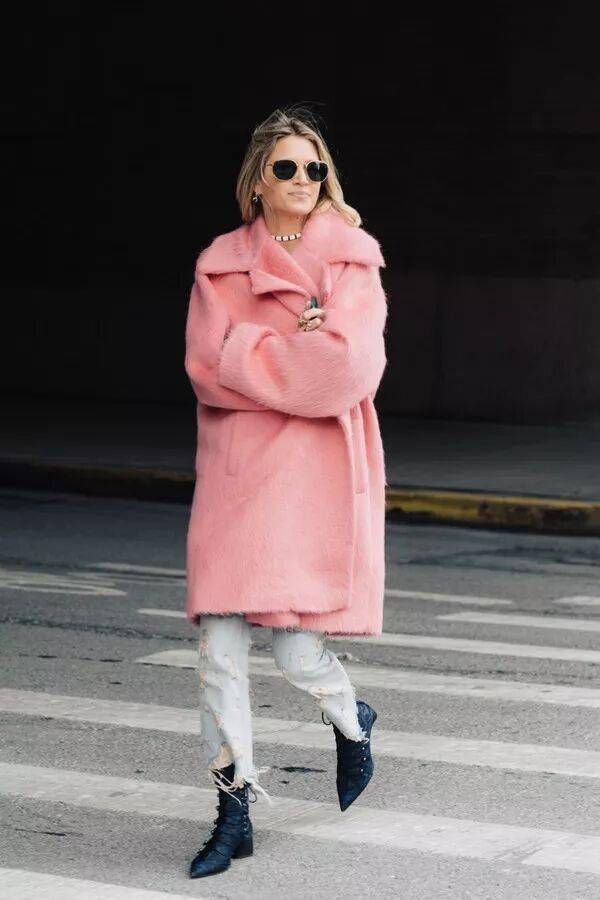 粉色大衣与牛仔裤+短靴是般配,清爽靓丽酷美兼具。中性风的牛仔裤和短靴能够很好化解粉色大衣的甜腻感,更加大气耐看。