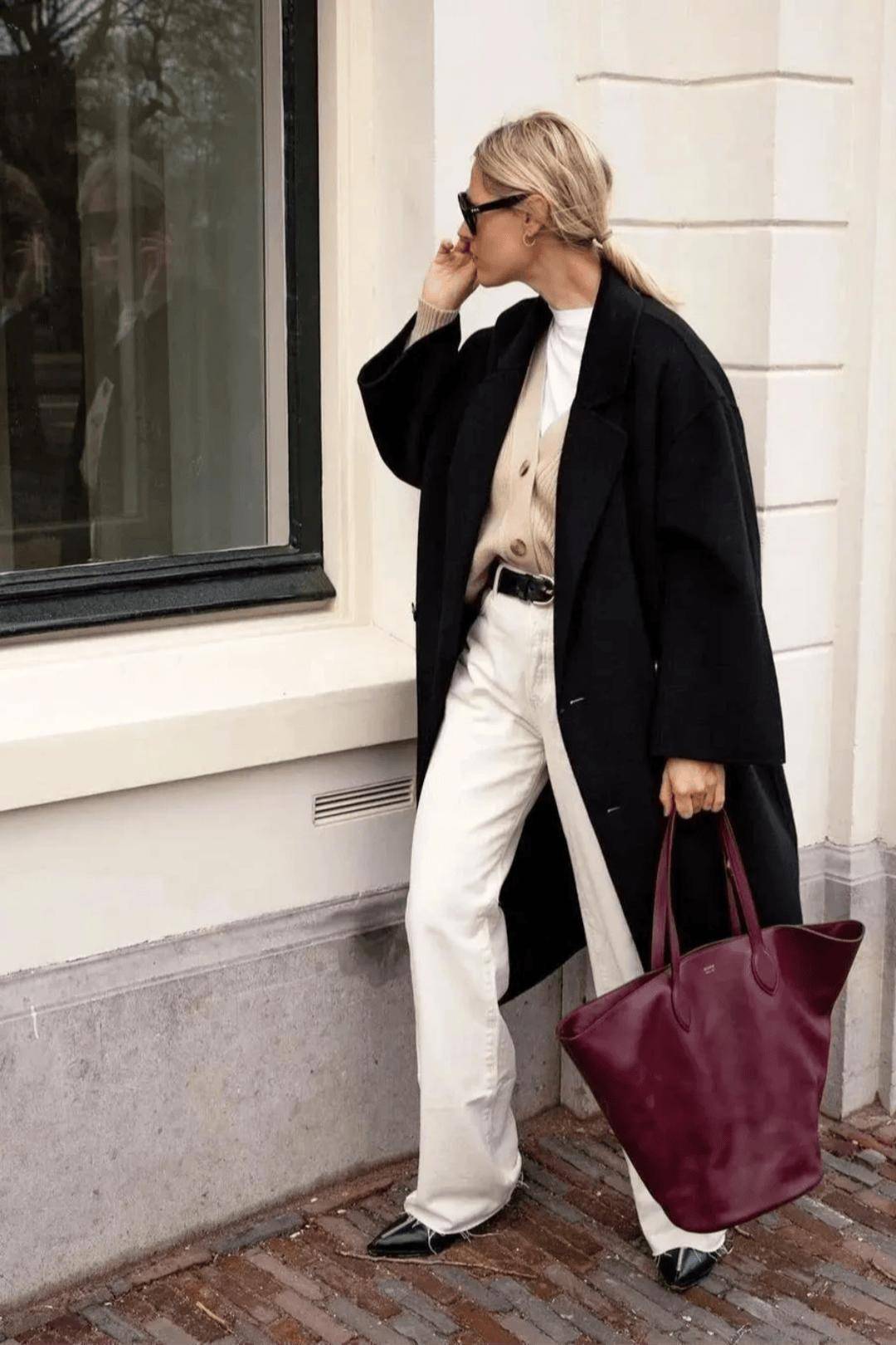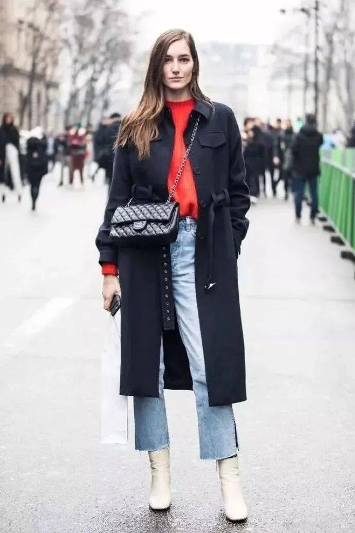 纯色大衣+牛仔裤+短靴的组合经典却也过于常见,因此我们在日常搭配的时候不妨花费点时髦小心机,便能轻松在芸芸众生中脱颖而出——首先,你不妨将基础款牛仔裤换成今冬流行的白色牛仔裤,整身搭配在视觉上立刻便能焕然一新,时髦升级。