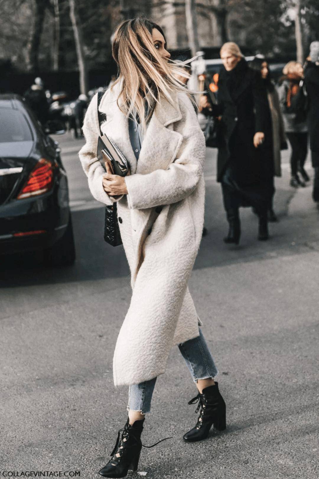 白色大衣向来是诸多款大衣中非常简洁清爽的。搭配牛仔裤+及踝短靴,便能打造出一种easy chic感。“牛仔蓝+白”的经典配色组合,亦能让你的冬季搭配告别臃肿,更加轻盈有范。
